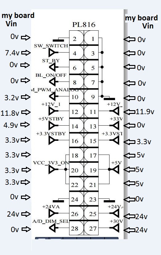 when turned on the standby light does not come on and the tv is effectively dead, but when i check the voltages to socket PL816 I do get some readings,