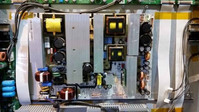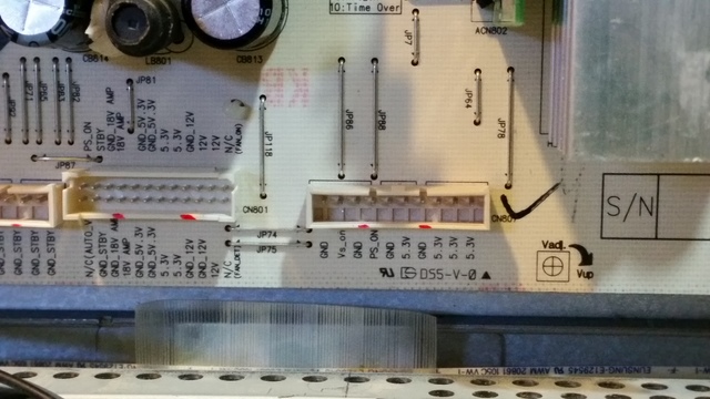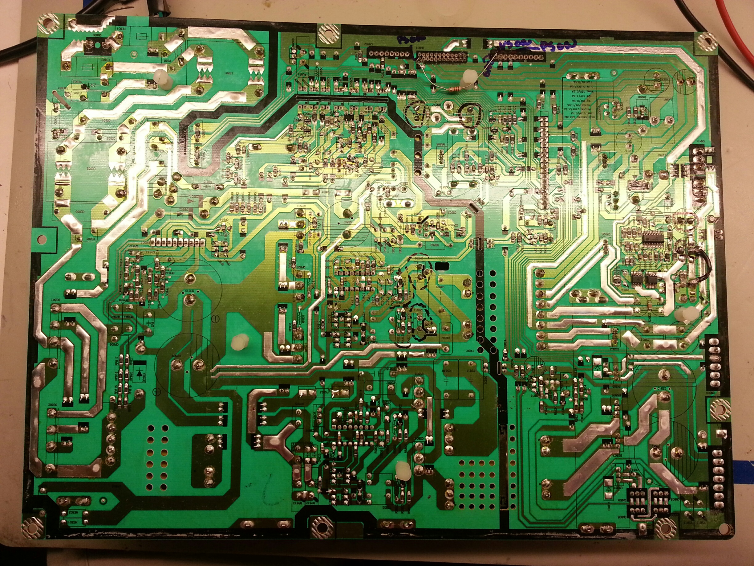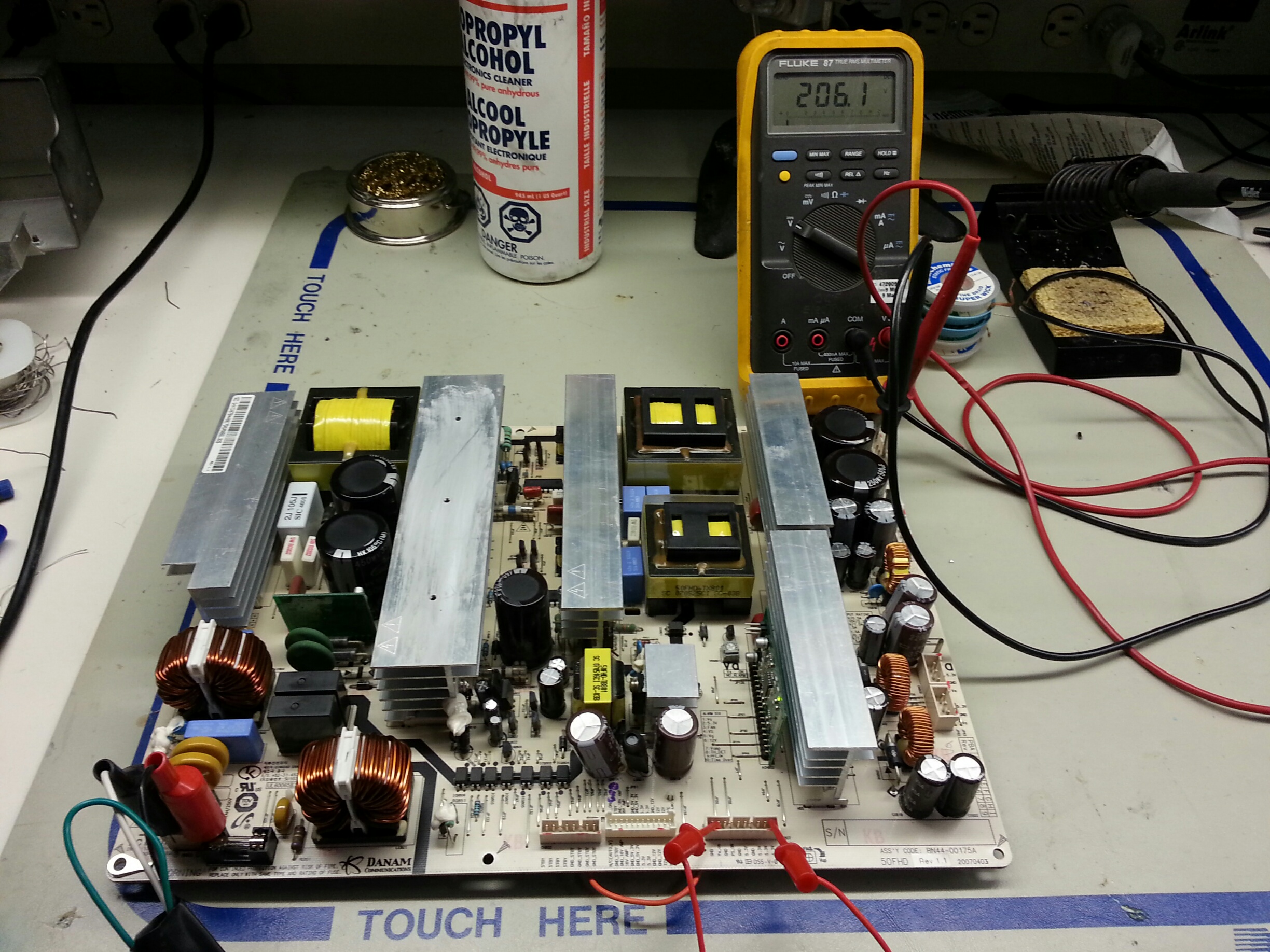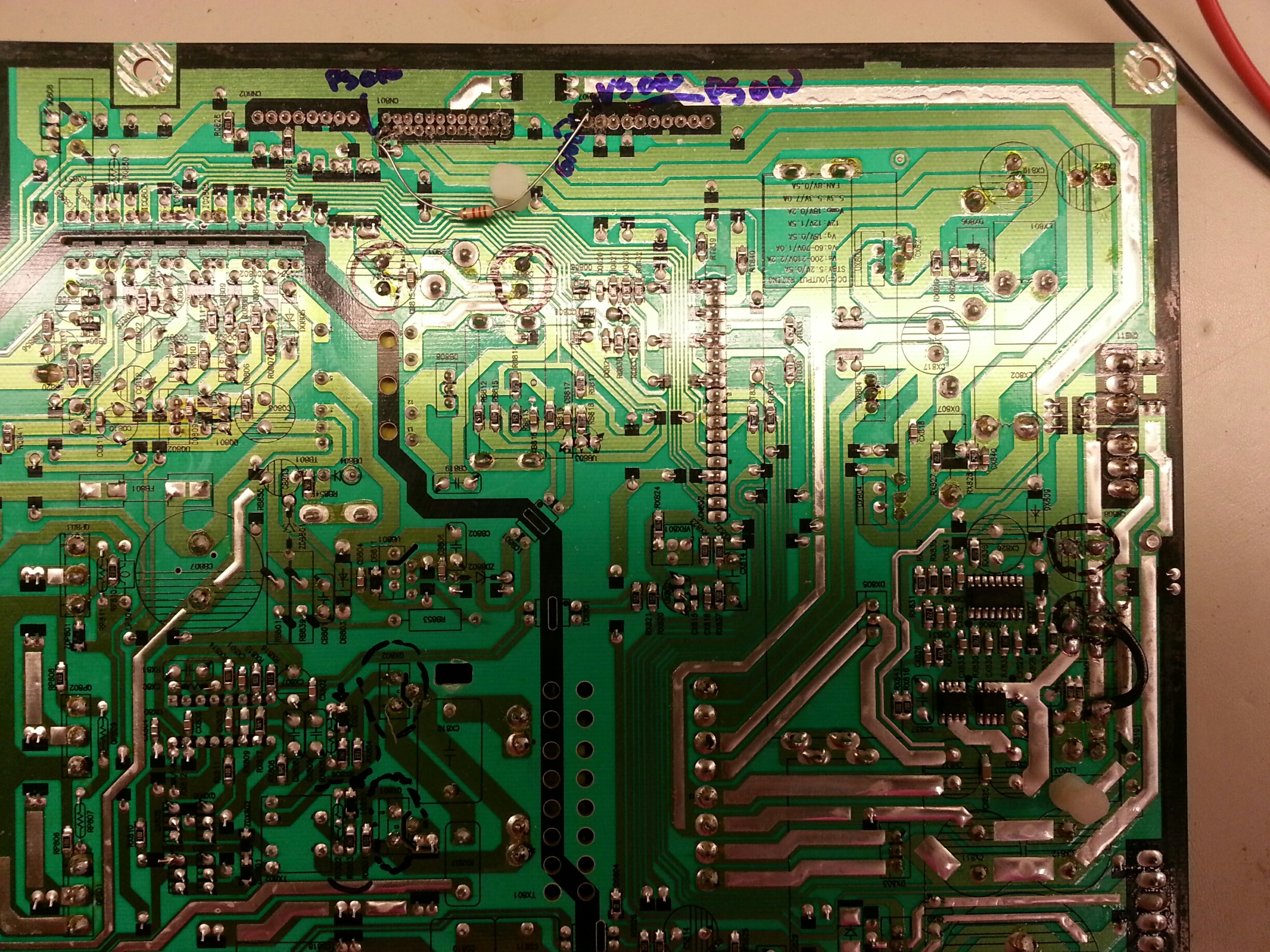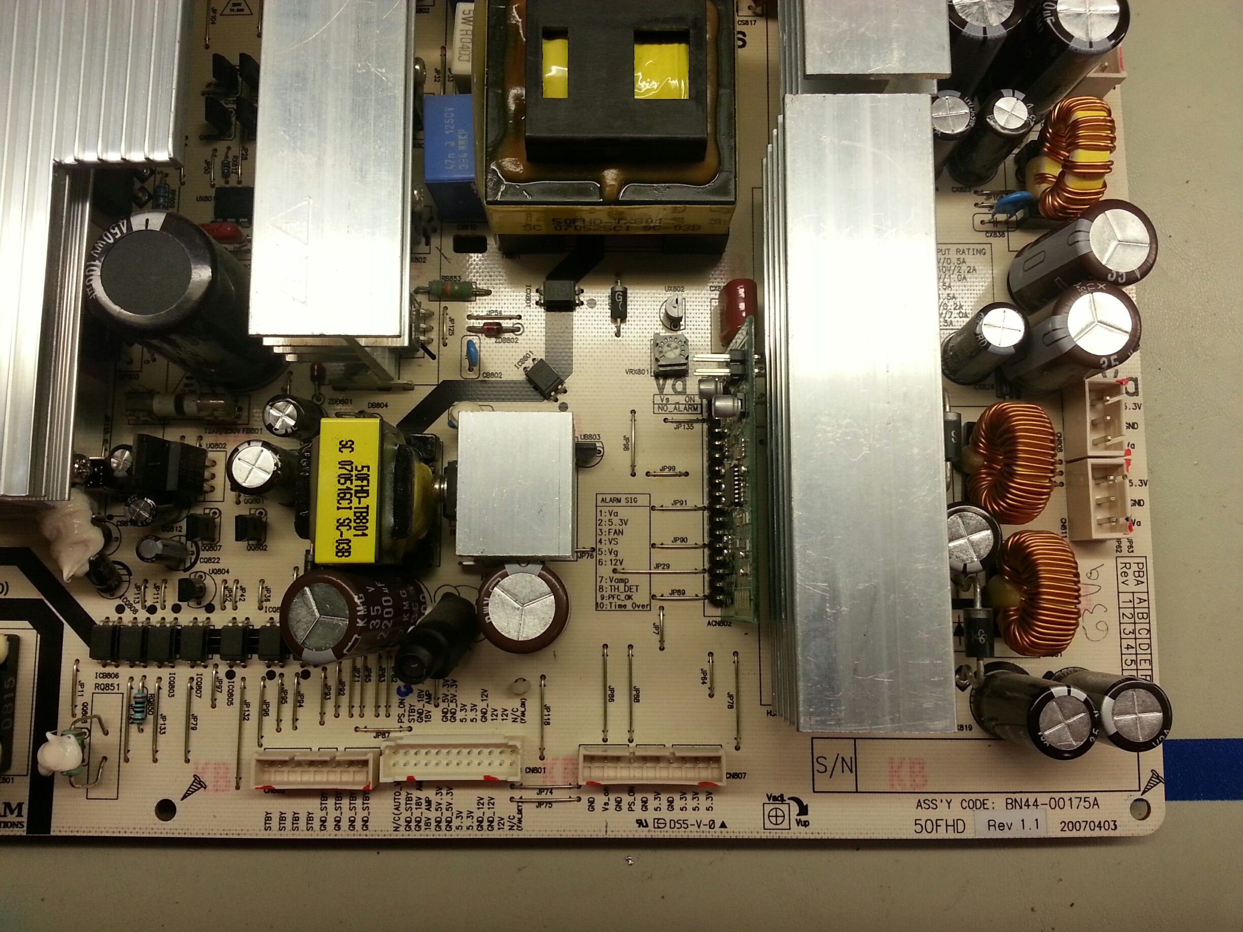 This is my first time posting and I'm hoping someone can help me out. I have a bn44-00175a power board from a Samsung 50" Plasma FP-T5084. The TV originally was clicking when powering and then shut down. My buddy opened the TV and changed the fuses (FE802 blown, and I'm not sure is FE801 was but he changed that as well). He also changed 4 bulging caps CB813, CB814, CX834, CX835. When he replaced one of the caps he lifted a trace and that's why I jumpered a little black wire on.