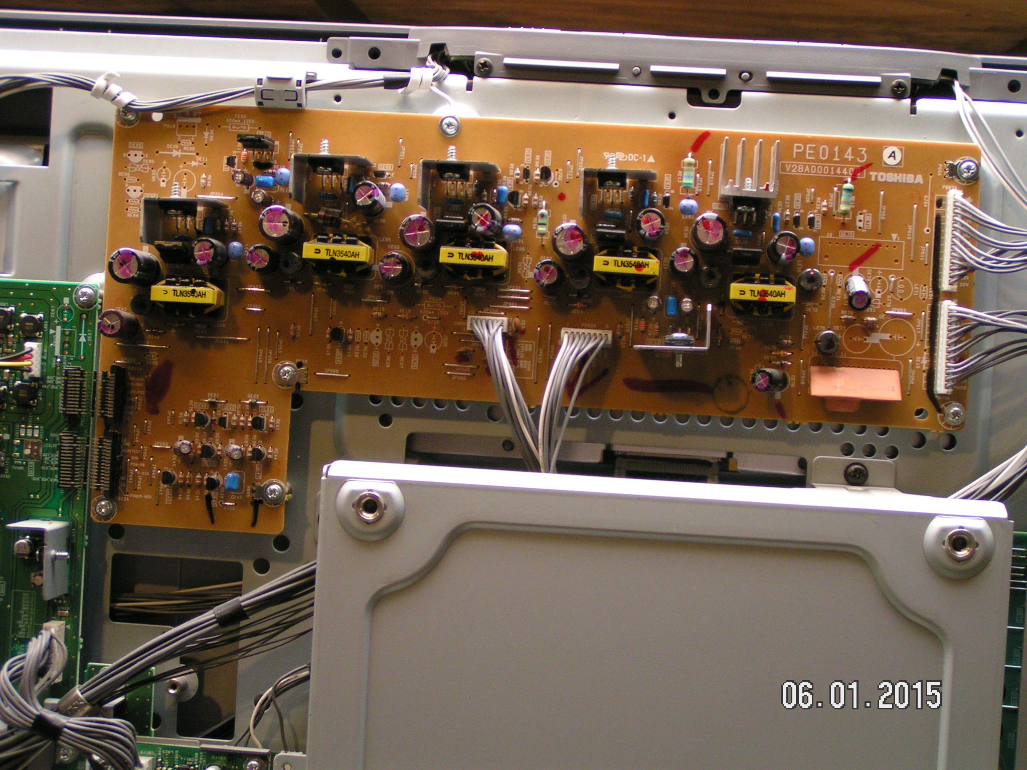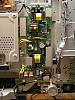 No picture nor audio--initially got an amber blinking light and heard clicking. Replaced most of the parts from a PE0071 Power Supply rebuild kit including three IC/rectifiers, a diode and a 450V electrolytic cap. Testing the voltages on the upper left side of the PS, I get 5VDC top to bottom, where they should be 12V for the first 4, GD's and a 32V.