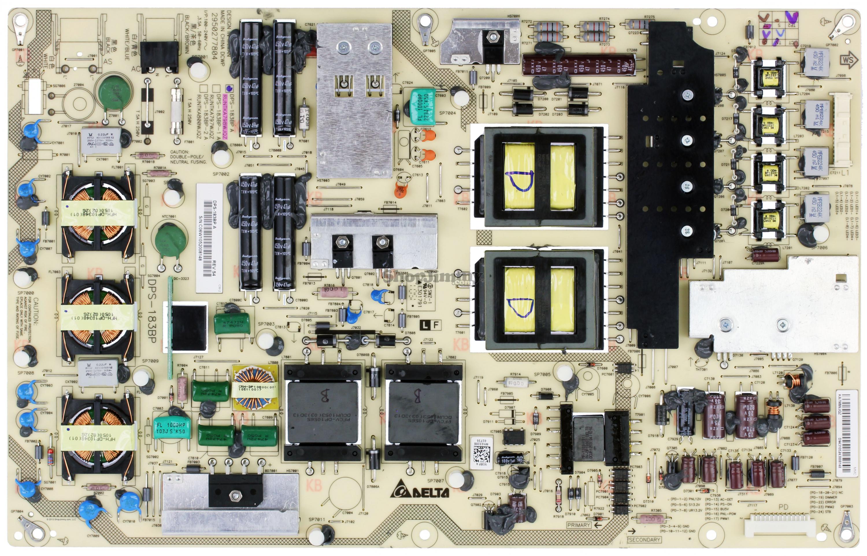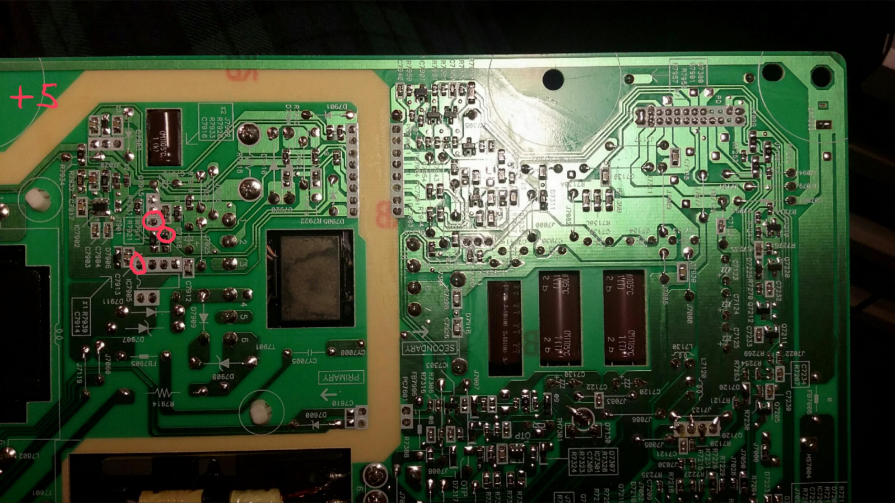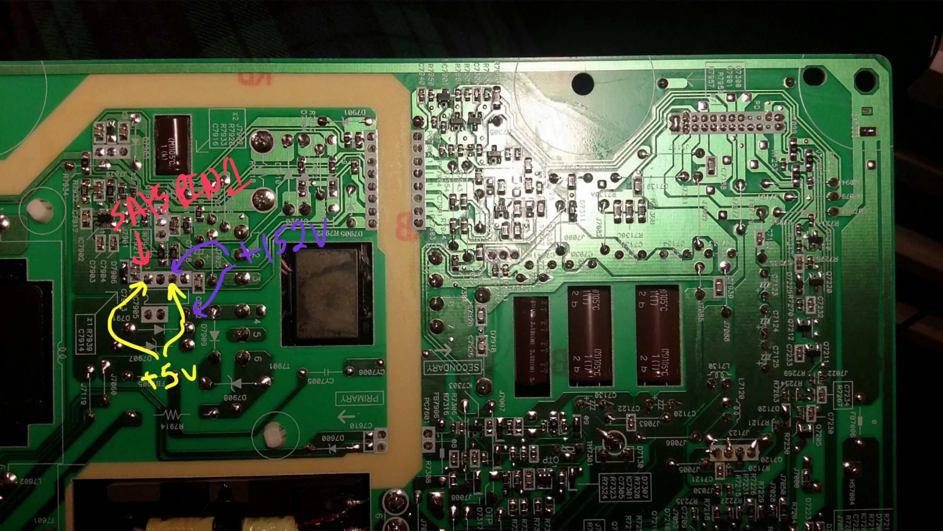 I downloaded the Sharp service manual but of course they omitted the PSU schematic as its made by delta. So i could use some guidence on where to look for the components that supply the 5vdc. I also have posted images of the board here. Thanks in advance for any assistance.