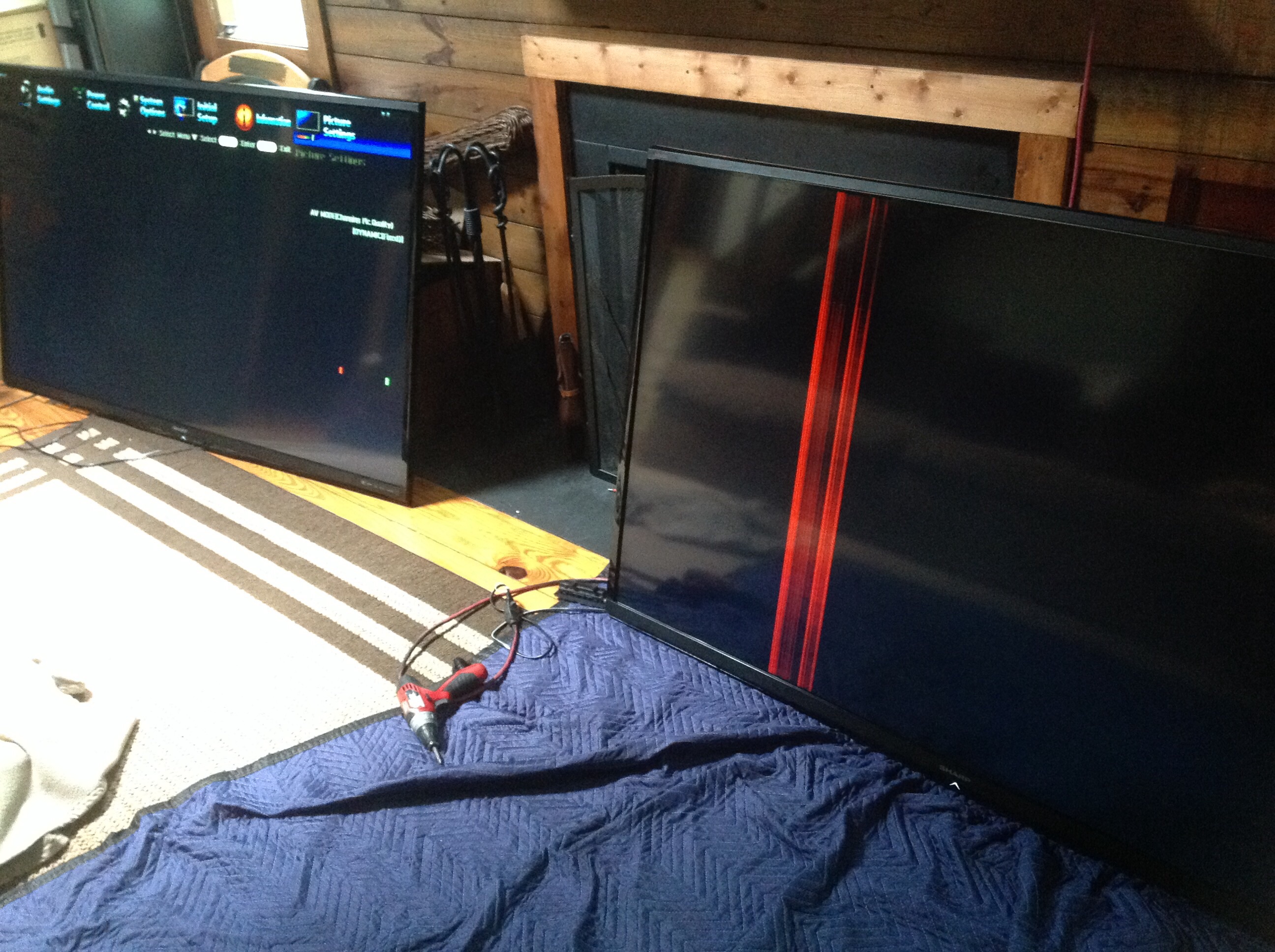 I have tried swapping board to see if problems follow, when I switched the T-con boards I got a vertical red bar down the middle of the TV that is partly working, when I put it back in the other TV the same bar was present, but not centered.