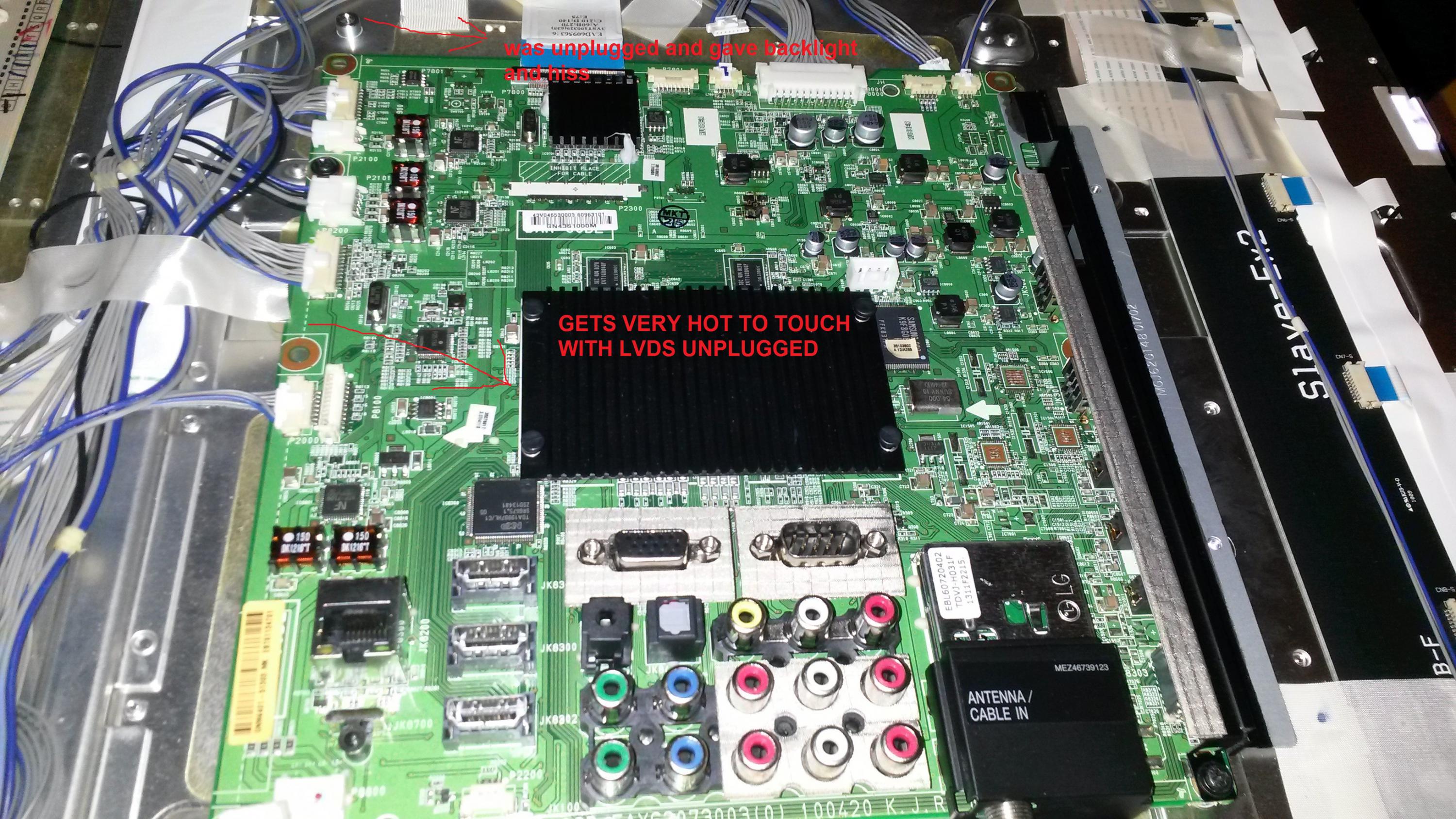 im thinking possible main board? the big heat sink in the middle of it gets hot to the touch with lvds disconnected.. if so no one has this board so i will need to try to do a repair on the component level. But i will need lots of help diagnosing the failed partsLast edited by whatusername; 08-08-2015, 12:34 AM.Comment