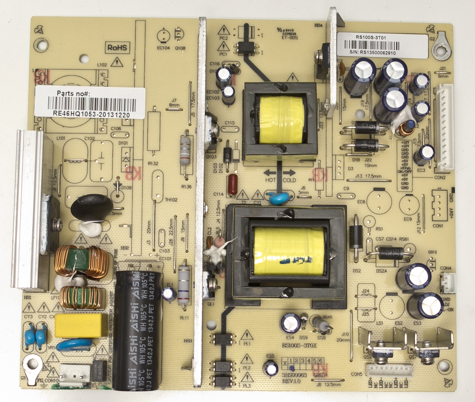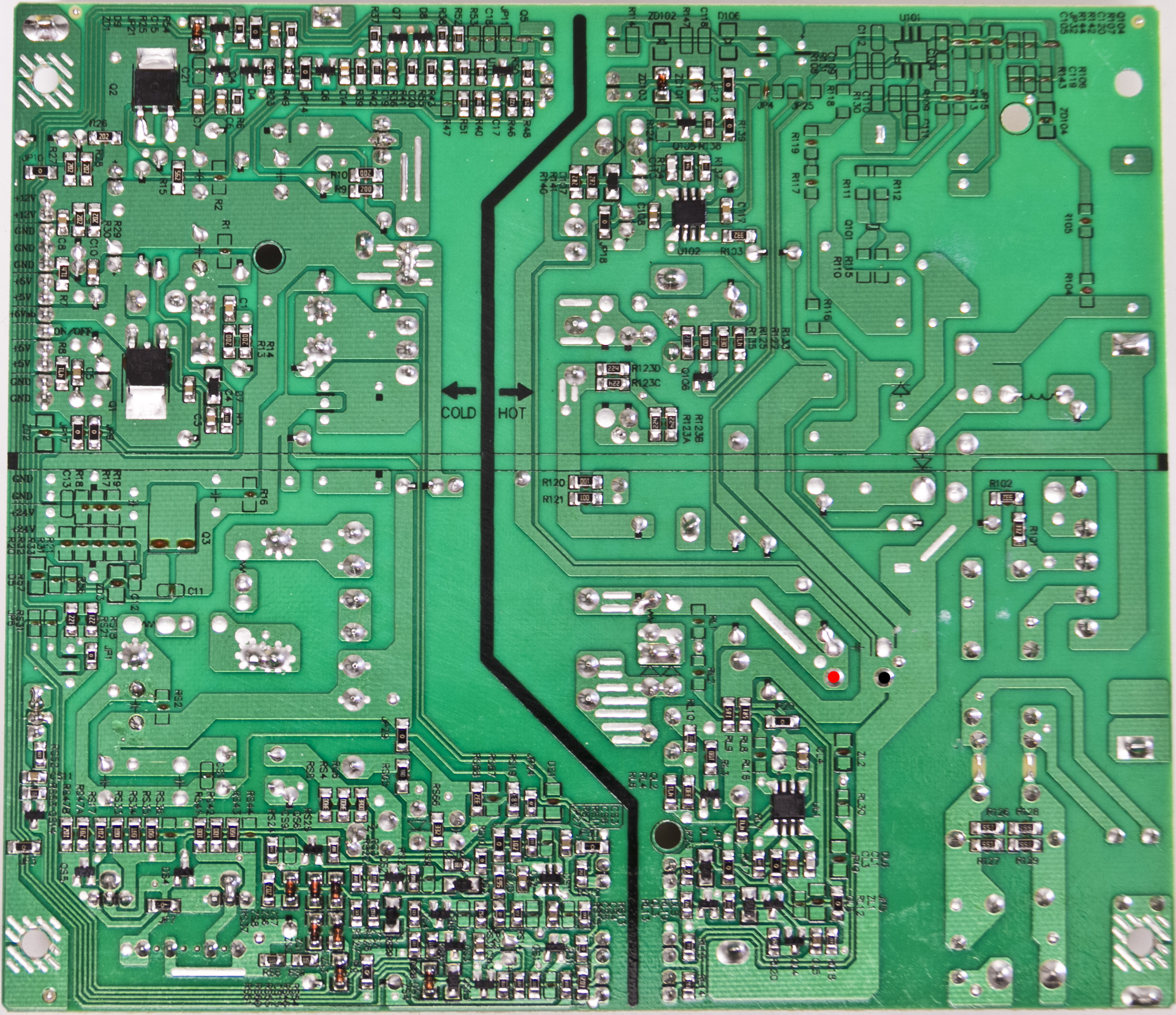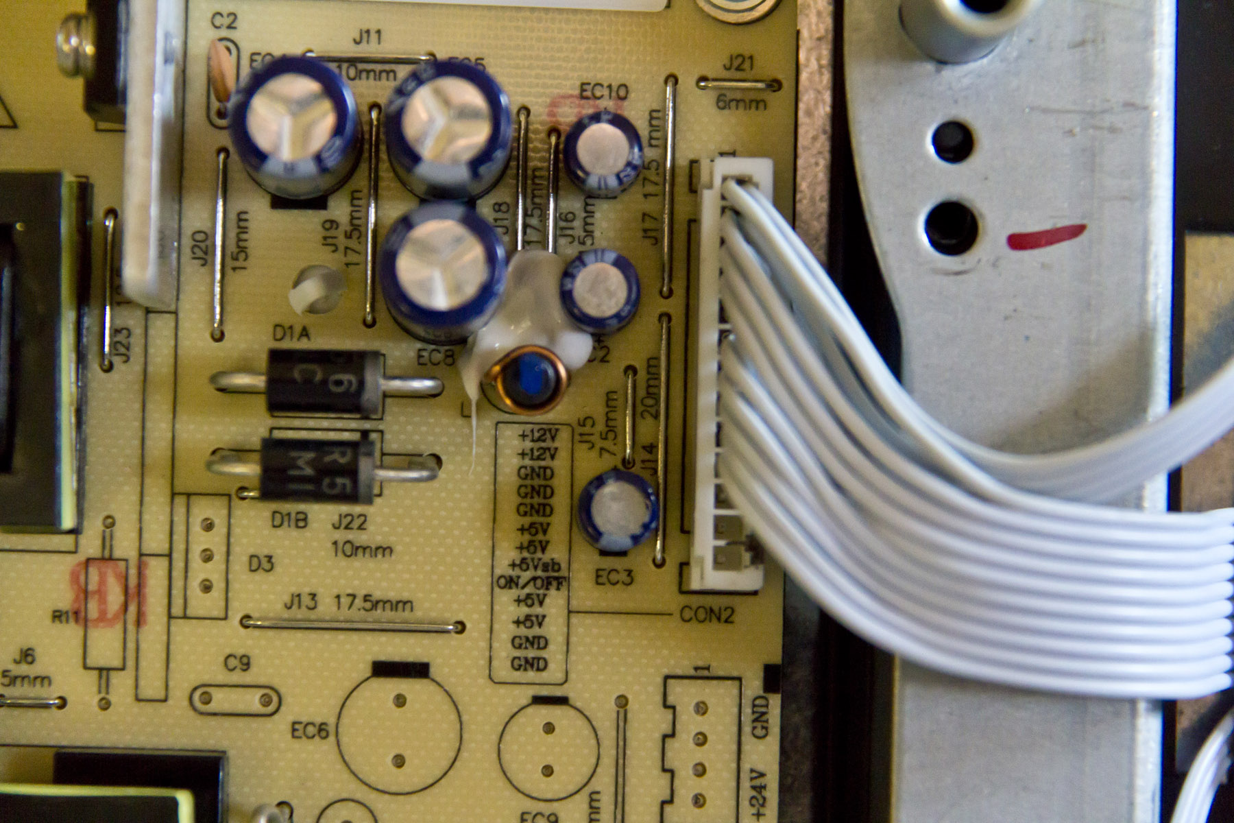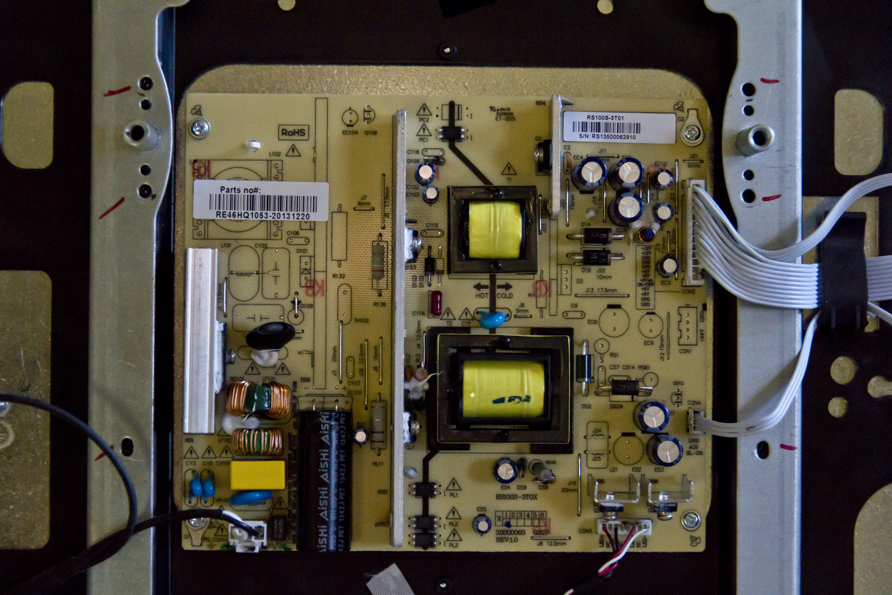 I have tried disconnecting the LED's from the PSU board, and hook up multi-meter instead, but no change. LED voltage comes on to over 120VDC (maybe more, I have no max function on multi-meter) and then it slowly drops down to 0V. rest of the voltages are as described above. Then I disconnected the T-Con, but same issue. I have disconnected the IR, same issue. I have quickly disconnected the buttons after I power it on, but same issue.