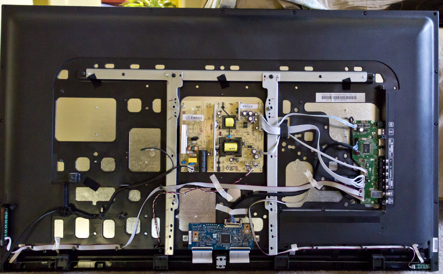I am trying to fix up LED42C45RQ, but it has been problematic. When I got it, I plugged it in. Red power LED lit up, TV did nothing (as it should, I believe). When I press the power button on the TV (I have no remote) the red LED turns off, and 3 second later the TV screen flashed twice fast (at least LED's do) and nothing shows on the screen while it does. Red LED remains off, and you can't do anything with the TV no matter what you press. I have to re-plug it to AC and then I can repeat the process.