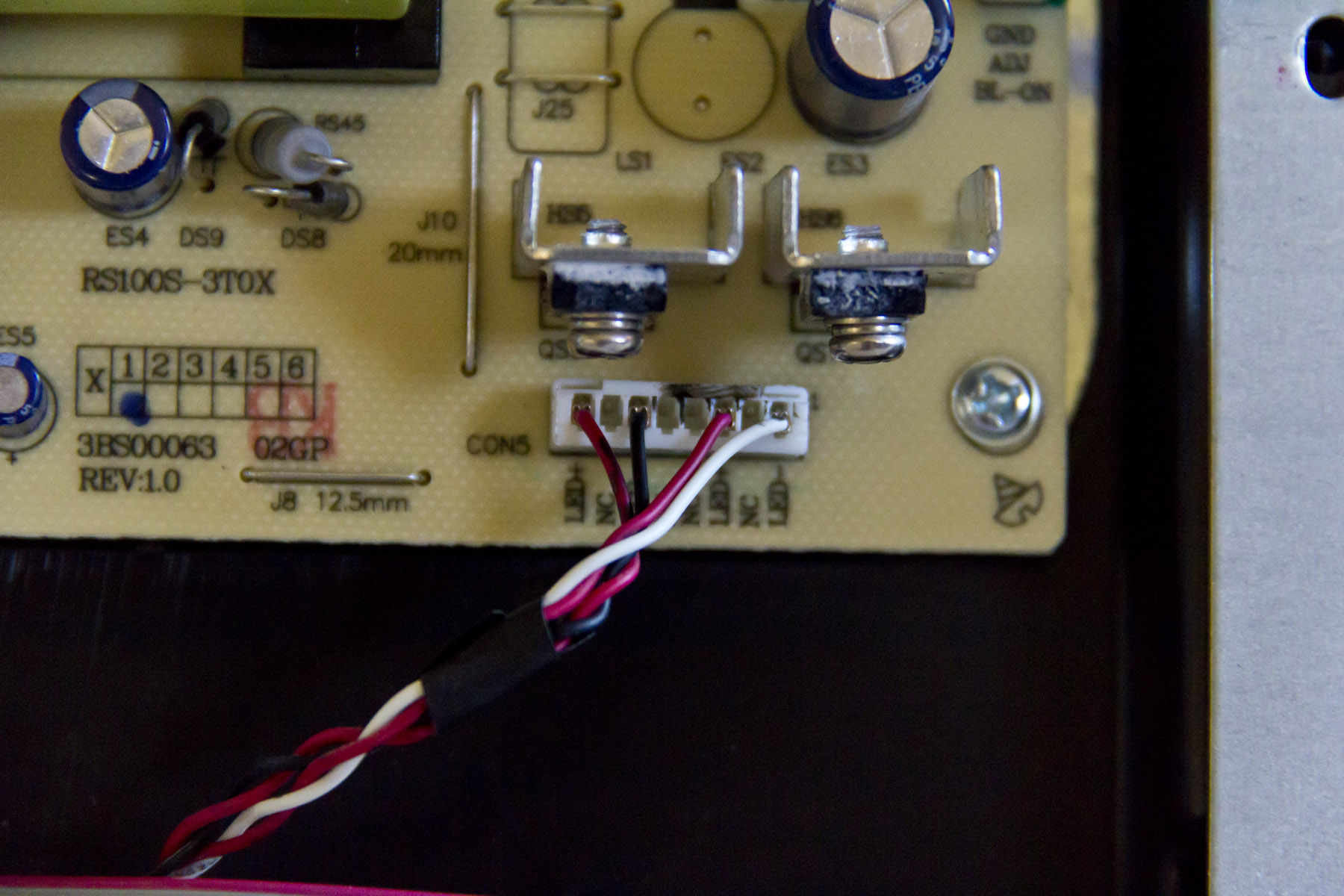 I have opened the TV up, nothing looked wrong. When the TV is in stand-by (red LED on) I get 5V on +5Vsb, but rest are at 0V. When I power the TV on, I get proper voltages all over, but after the screen flashes (3 seconds after power up) the +5 and +12V drop to 0V, and all I get is 5V on +5Vsb and ON/OFF. After the TV's power up, and after the flashes, I am reading 3V on the BL-ON pin.