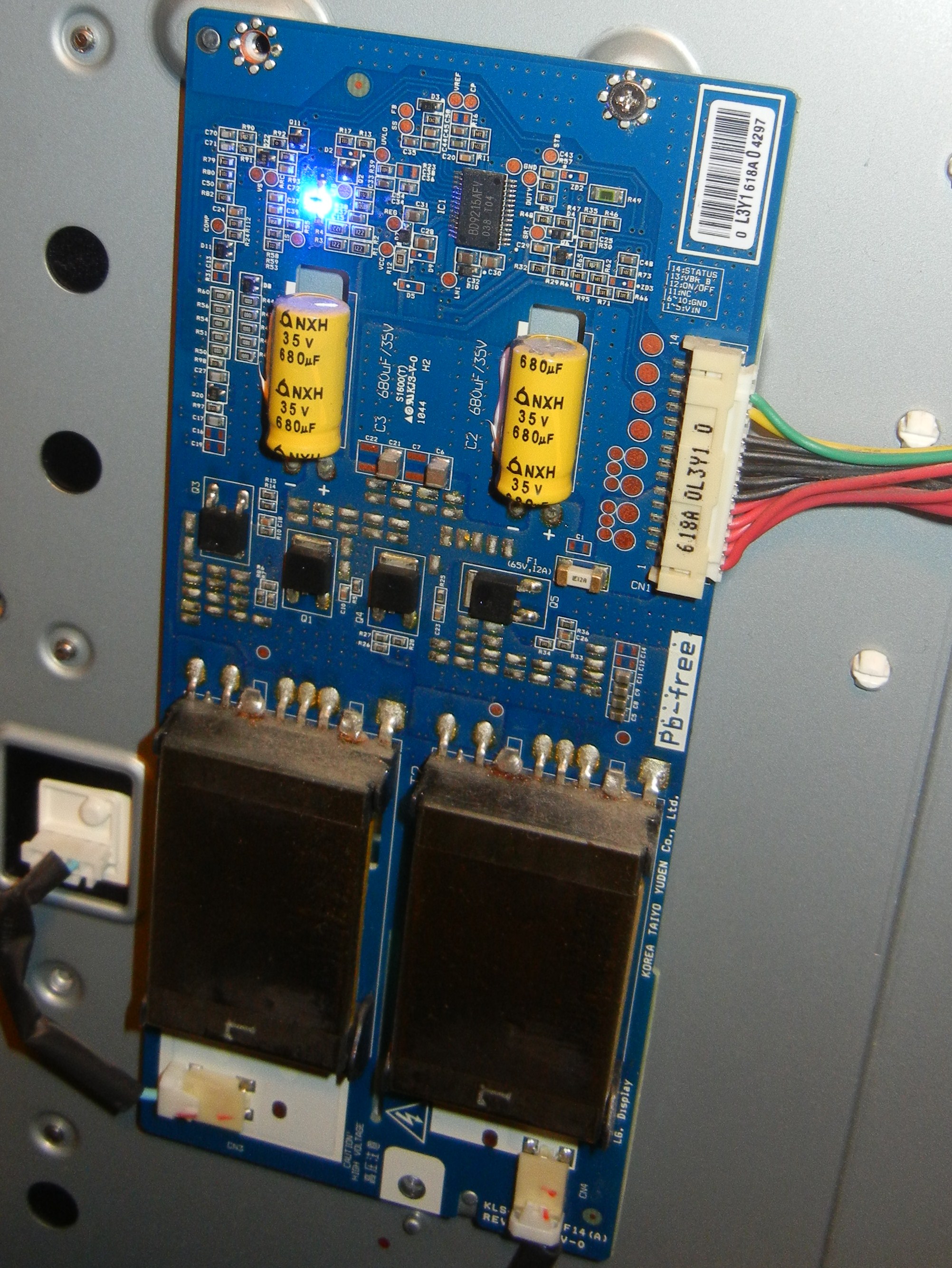 This is an LG edge LED lit LCD Display. The LEDs are on the bottom edge of the display. There are 2 bars (left and right) Each bar has many LEDs and a 6 pin connector. Each pin drive several LEDs thus is the highest current flow / heat junction. The weak lead free solder gradually fails with thermal expansion/contraction cycling and increases resistance. PSU will compensate up to a point, then when the current is too high, PSU just shut down the backlight causing a dark display. I have even seen one which the connector just fell off as solder points became completely detached....-