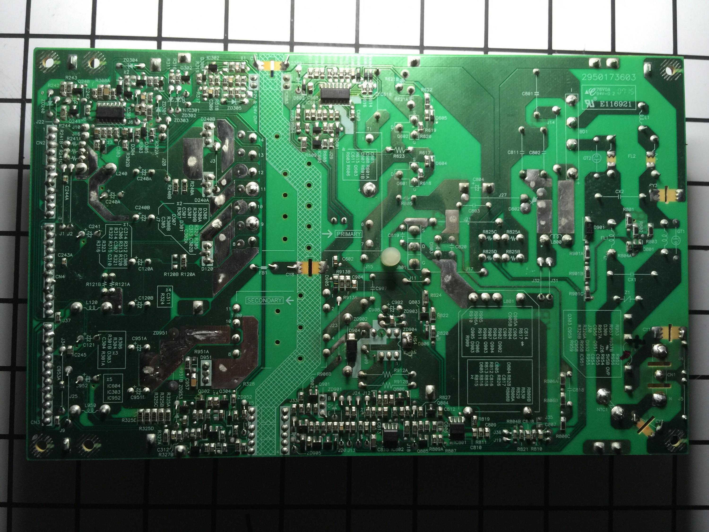 Background: TV appears to have taken a surge from the AC coming into the unit. Other than some discoloration on the chassis and slight black discoloration around the AC terminations everything seems to look good appearance wise. No buldged caps, no burnt fuses, no popped resistors, etc.