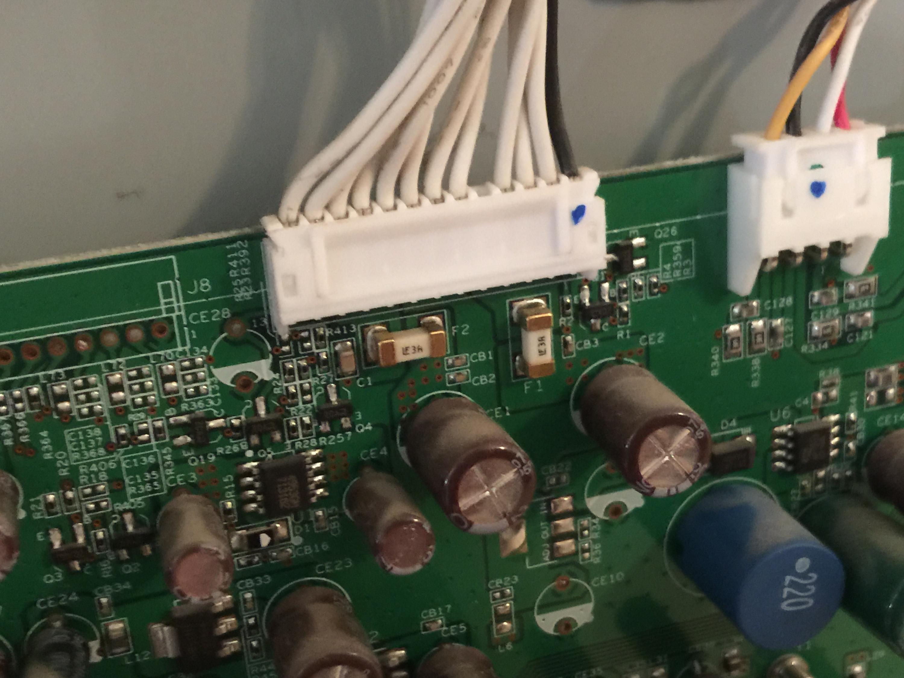 After plugging the TV in I found that it would not attempt to power up. I checked the main fuse on the ps and it is good. I checked fuses f1 and f2 on the main board and both test fine as well but f2 does not have the 5v input or output that it is supposed to have from the ps.