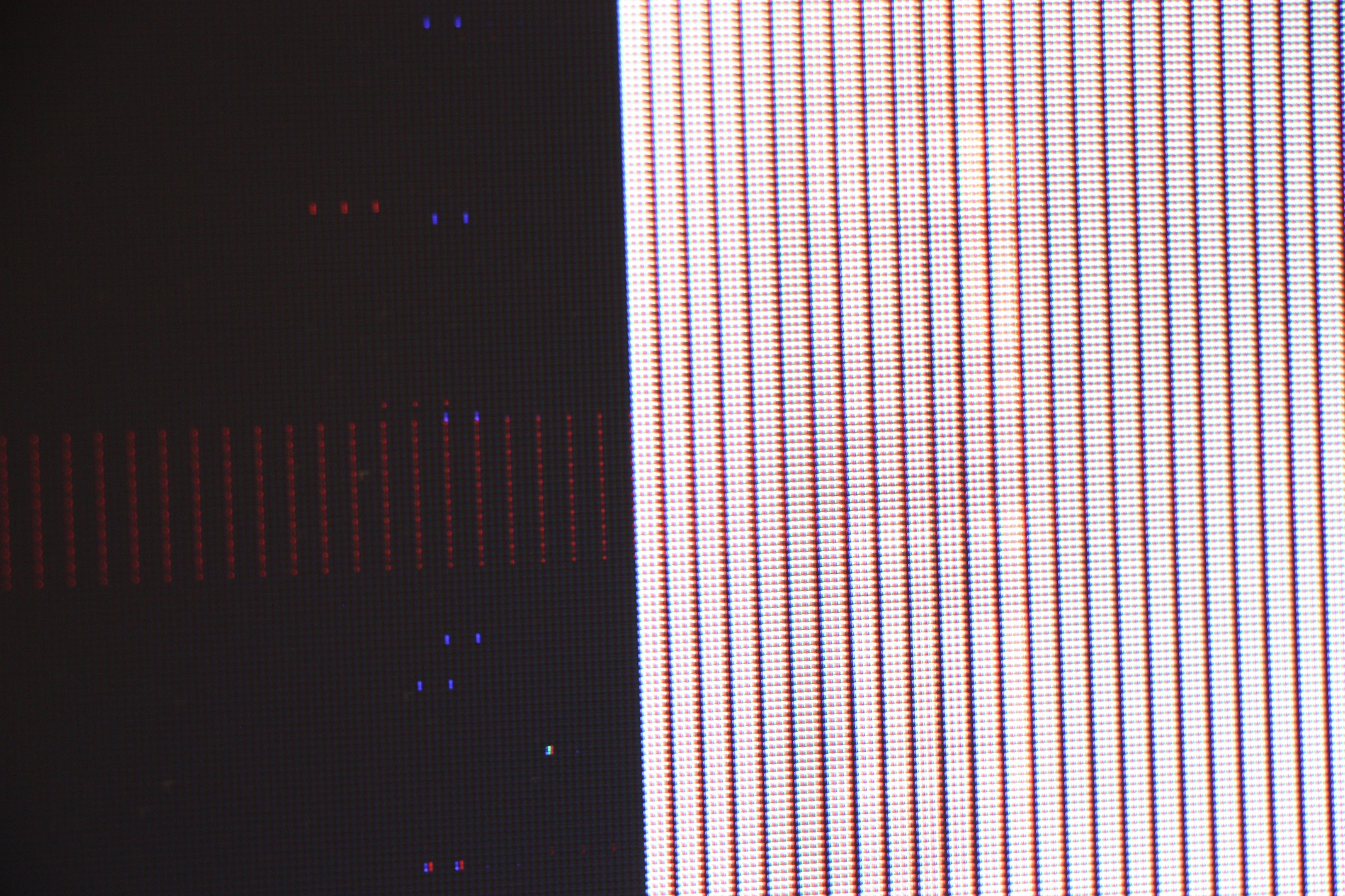 If you get up close the display you can see a clear pattern running horizontally across the screen. Every 4th pixel is black. 3 on then 1 off.