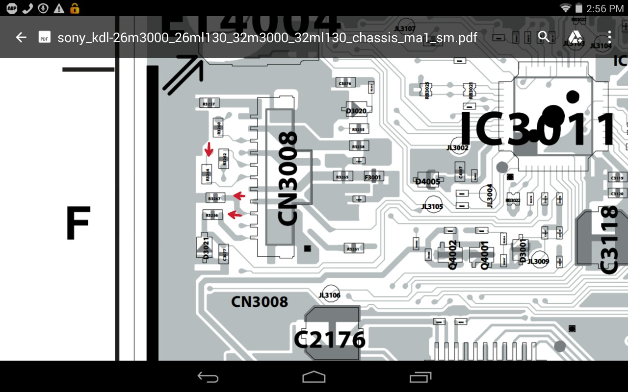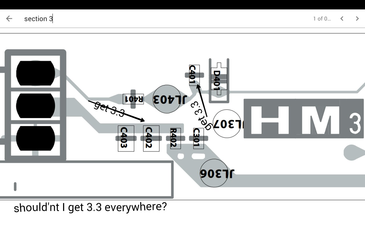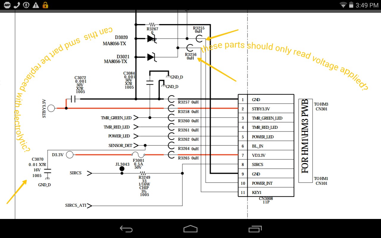 tested those and they measured 3.3 note that all caps and beads are not being used on this particular set just the ones I inquire about others are for different models so as not to confuse anyone my fault for not mentioning it earlierif you have a oscilloscope, you can hook up the probe to the out put pin of the IR or on Pin 8 of the connector and check for pulses to see if it receives IR. On the conductor side of the HM3 board, IC 401 is mounted on the other side on the left (see your picture), the middle pin, there are 2 chip caps, see if they are shorted to GND or not.Attached Filesif you find these attachements useful please consider making a small donation to the site