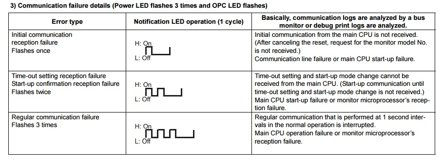 Power LED flashes 3 times. Communication failure with main CPU. See Codes and Codes3