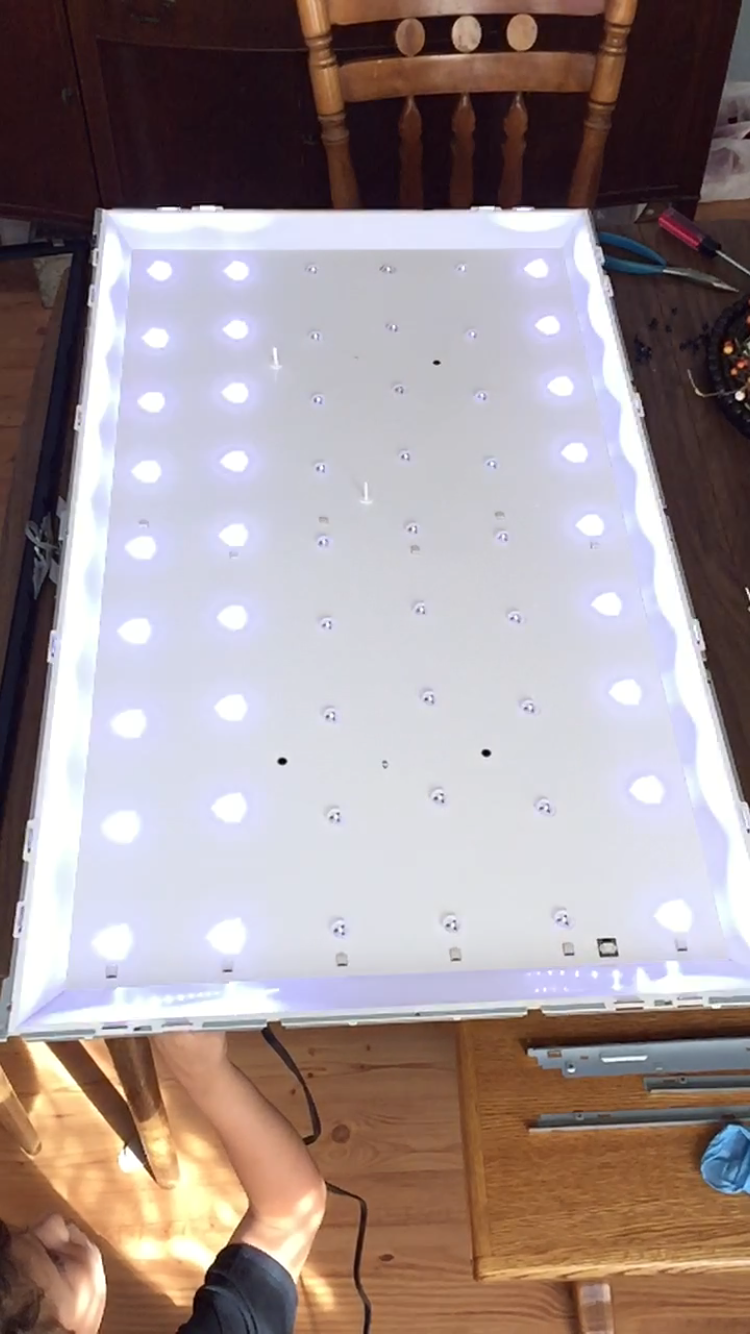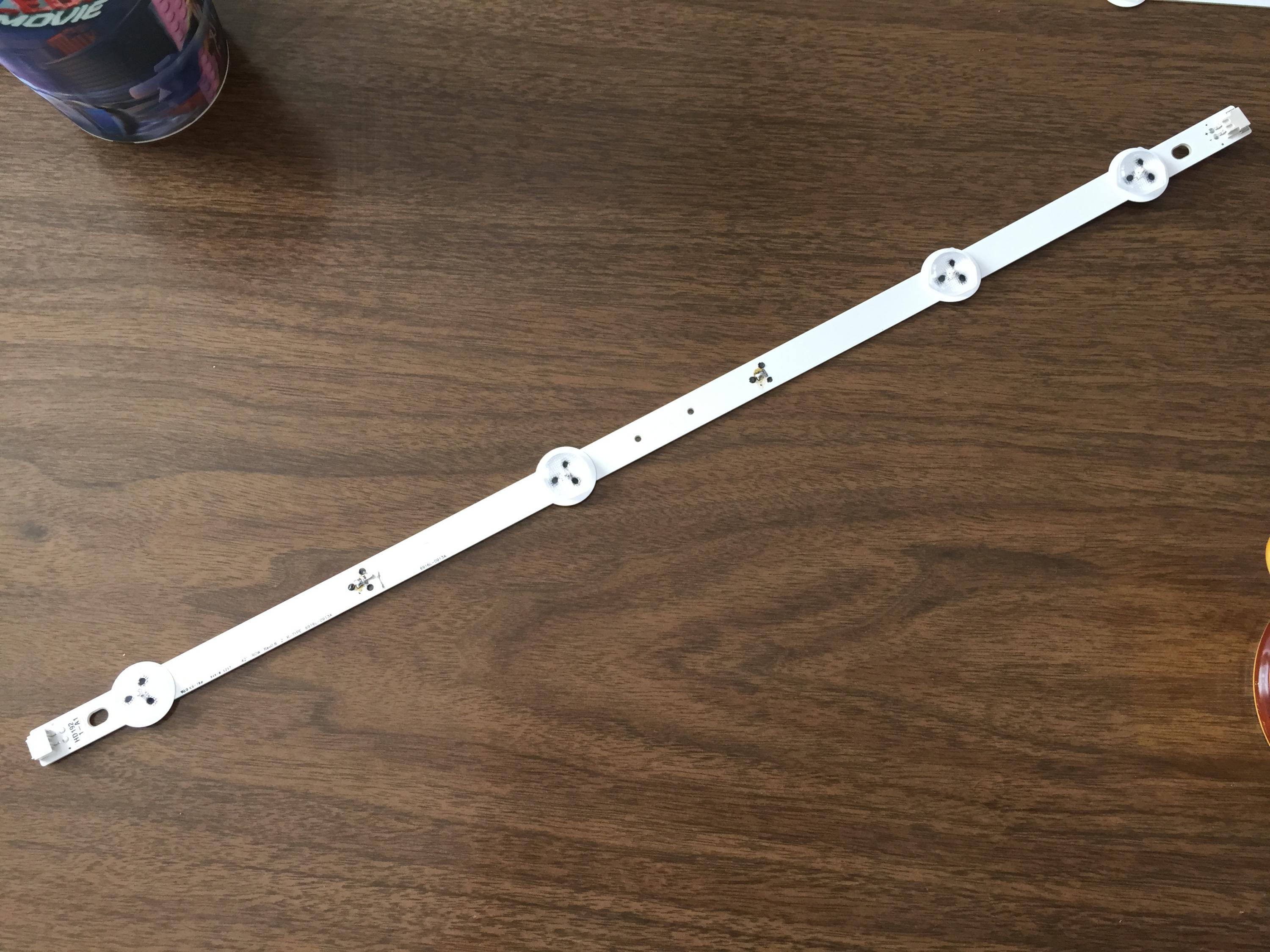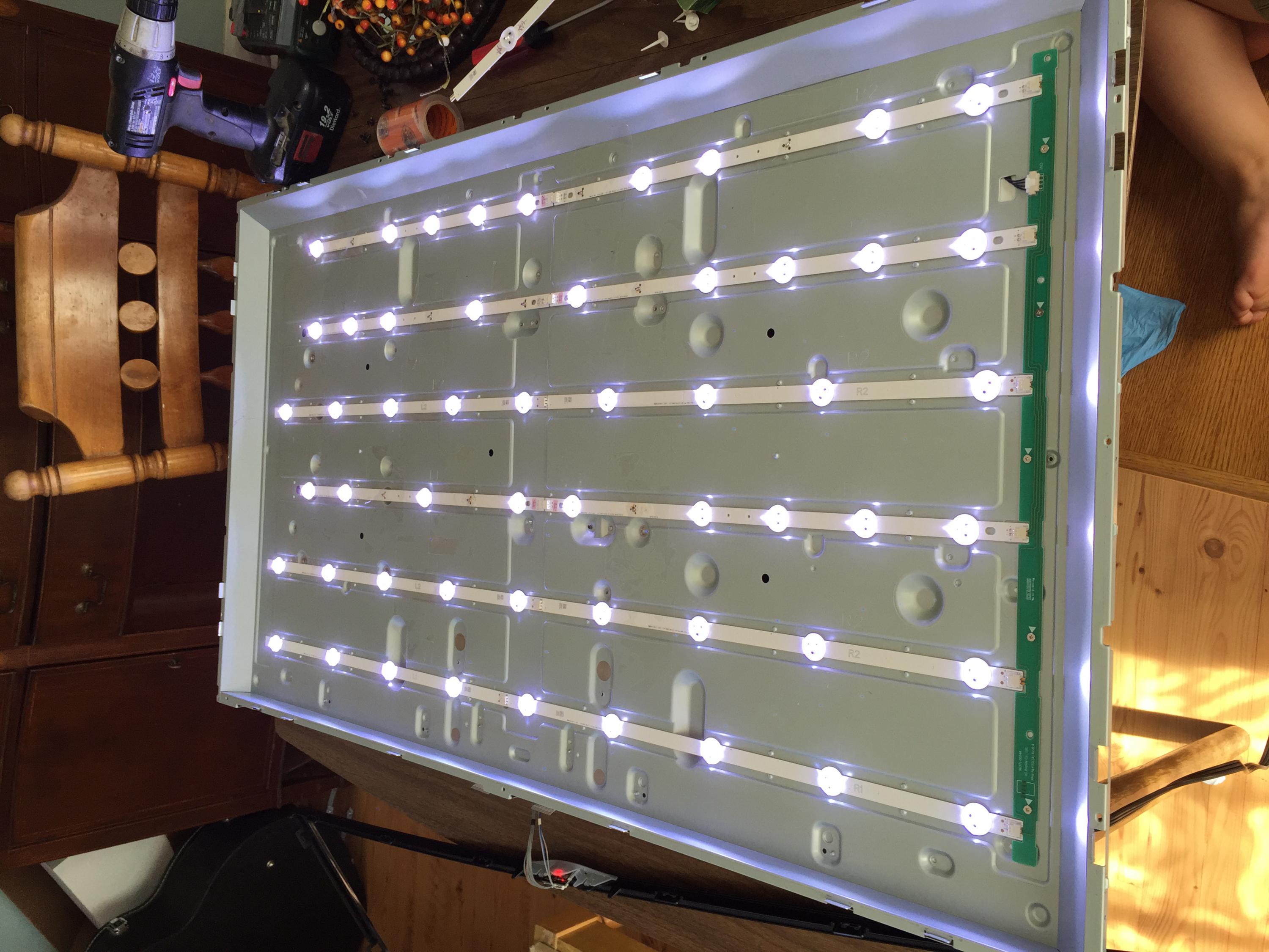 I found this TV in a dumpster this week. It would flash at startup and then had no picture. I opened it up today and found three bad strips. My method is to record a video of the flashing LEDs and then take a screen shot of the paused video showing the LEDs lit. Once I identified the bad strings, I got to work. I was hoping to be able to get at lease one good string out of the three bad ones. It didn't work out that way. Fortunately, I parted out a 42" LG LED TV years ago and still had the LED strips. The 47" strips were made up of two strips, one with 4 LEDs and one with 5 LEDs. The replacement strips were made up of two strips with 6 LEDs each. I removed one or two LEDs from each of the 42" strips based on what was being replaced. I then bridged the pads from the missing LED with solder. Lucky for me, these replacement strips plugged right in just like the old ones.