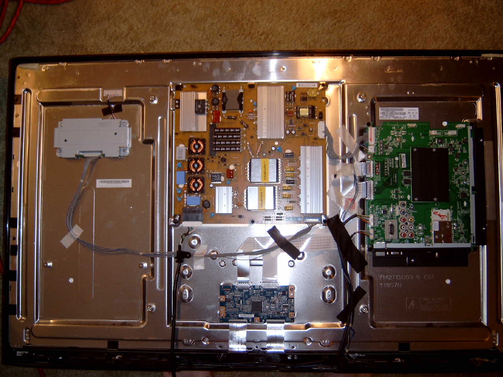 I thought that the tv fault was the gamma ic on the t-con board since the symptoms look like the solarization fault. There are some fine vertical lines to the left of the images and the colors are messed up.