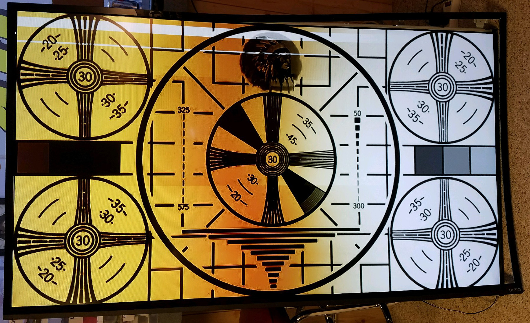 Before I fired it up to watch it blow a FET, I decided to disconnected the jumper cable from the two boards on the left. I disconnected from the lower board, so that the jumper cable is out of the equation. I now get lines across the top of the test pattern, see attachments. Not sure if this means anything. I thought I read something in this thread that were the lines are tells you which driver tab is bad? OR does this mean something else is wrong with it?