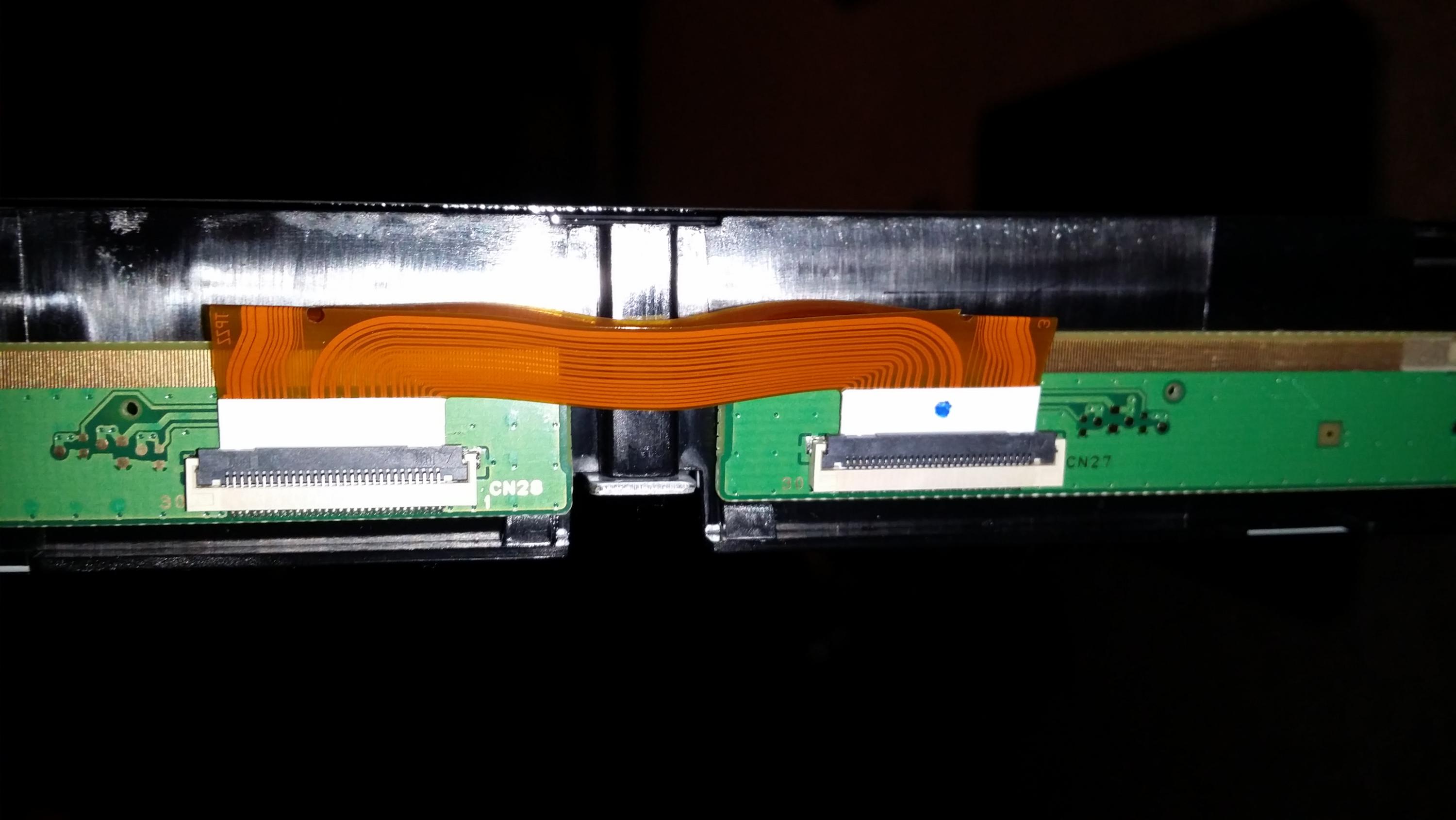 Well I removed the bezel to take pics then reconnected it and the ir / on/of, vol etc button cables with only the left 'LCD driver'? cable unconnected, the right side connected. I fired it up and played a youtube vieo through chromecast dongle from a tablet-this is what displayed- the flickering lines were mainly on in upper middle and strongr on the left side. The full color flash graphis would come every 15 -20 seconds and last about 2 seconds. You're saying thees a problem with the t-con even though the reading checked out? I may have touched or messed something up when I changed the transistors- I did 3 boards- I know it looks like the mad hacker did it if you saw the pics after I did them- it was like trying to split an atom. Anyway, So I should take pics from where the film-like cables connect to the panel?