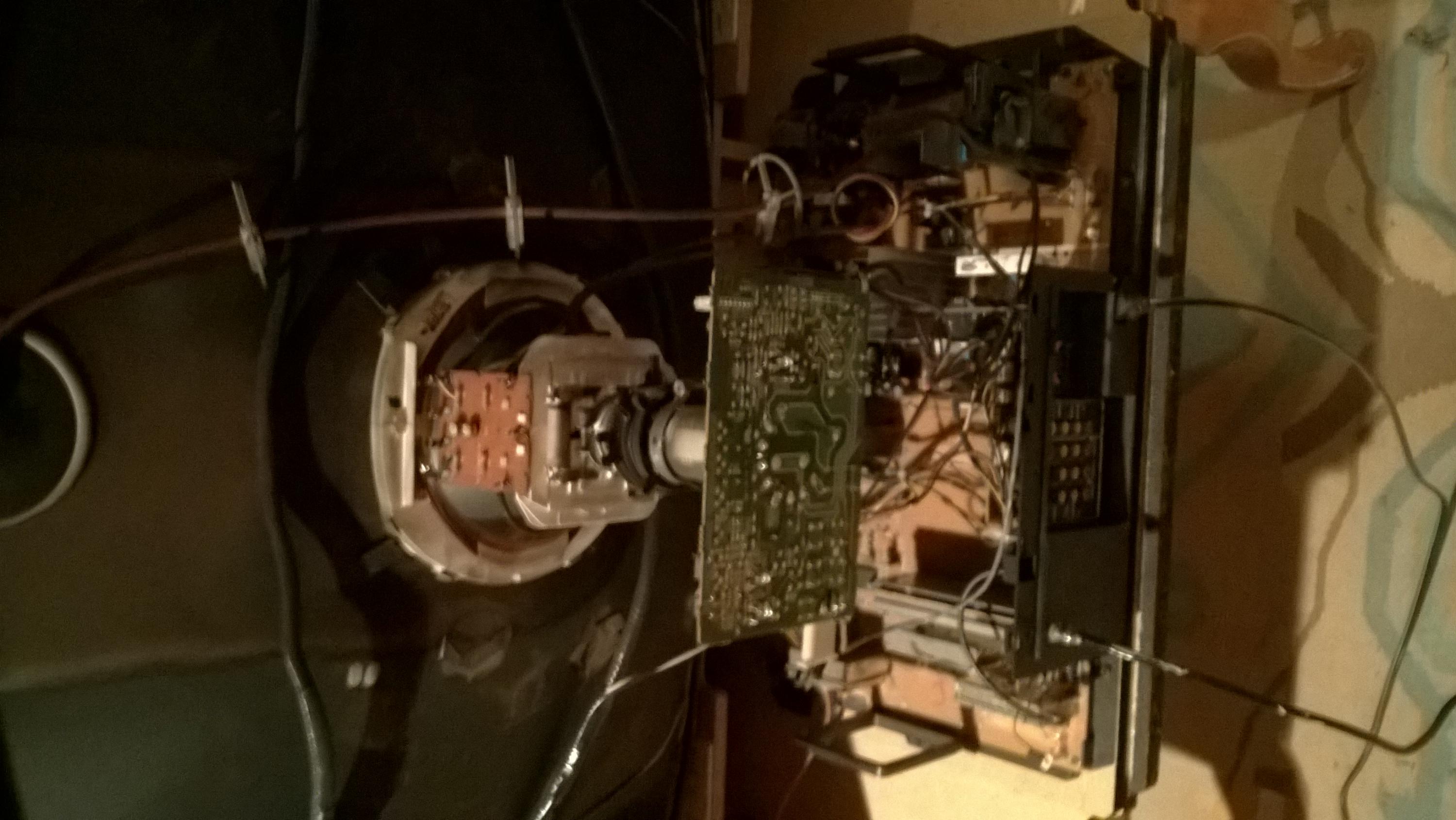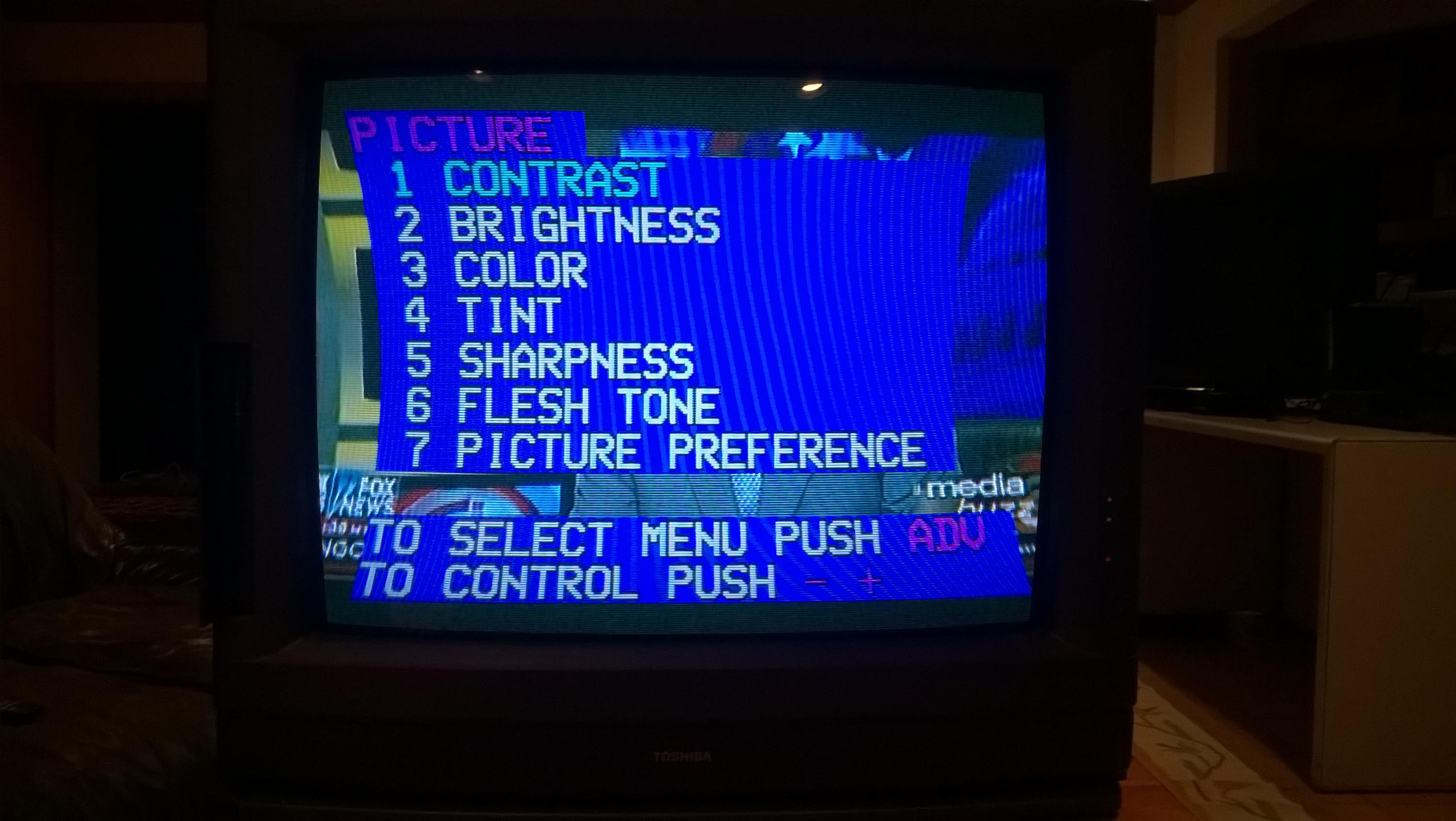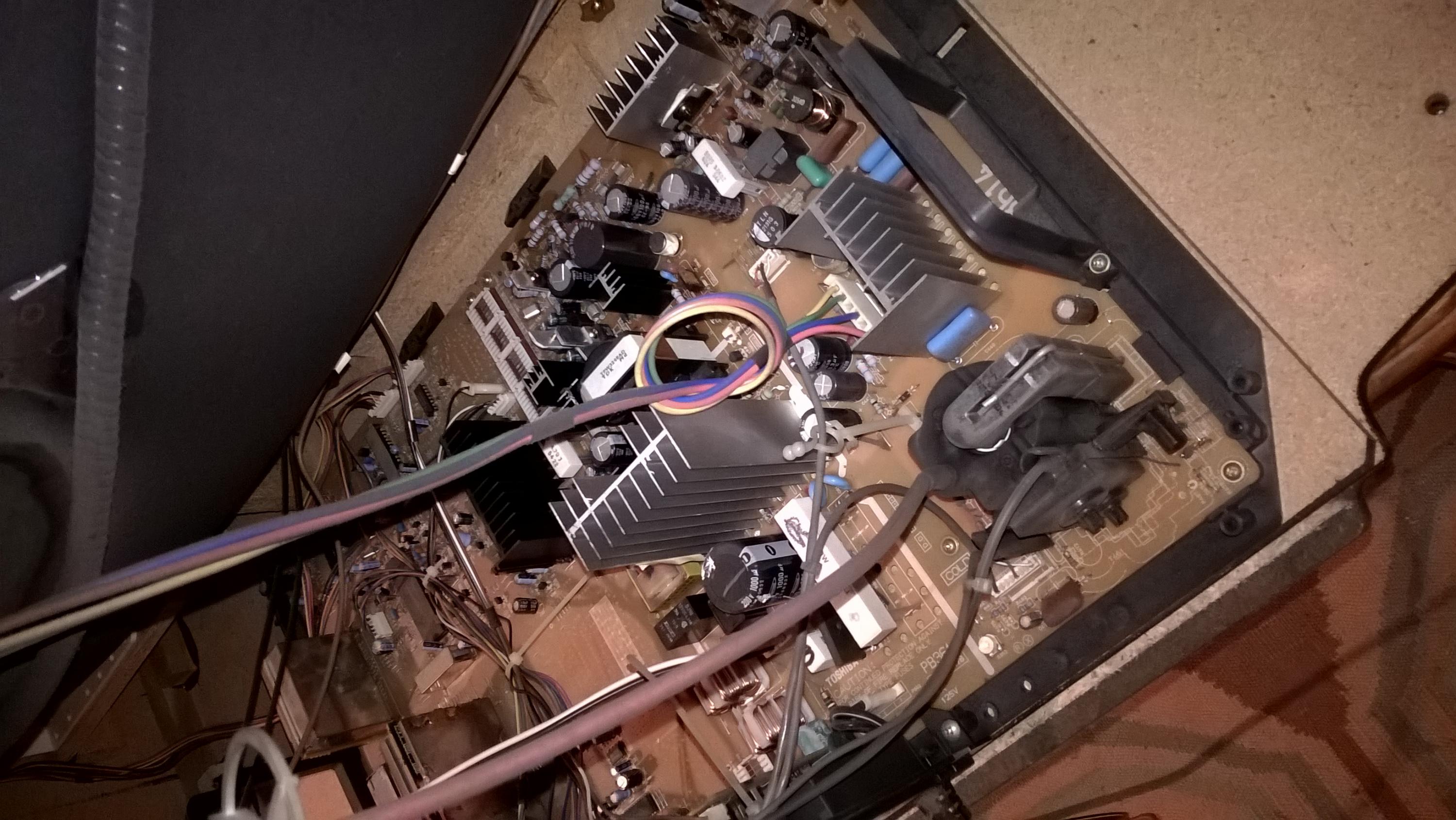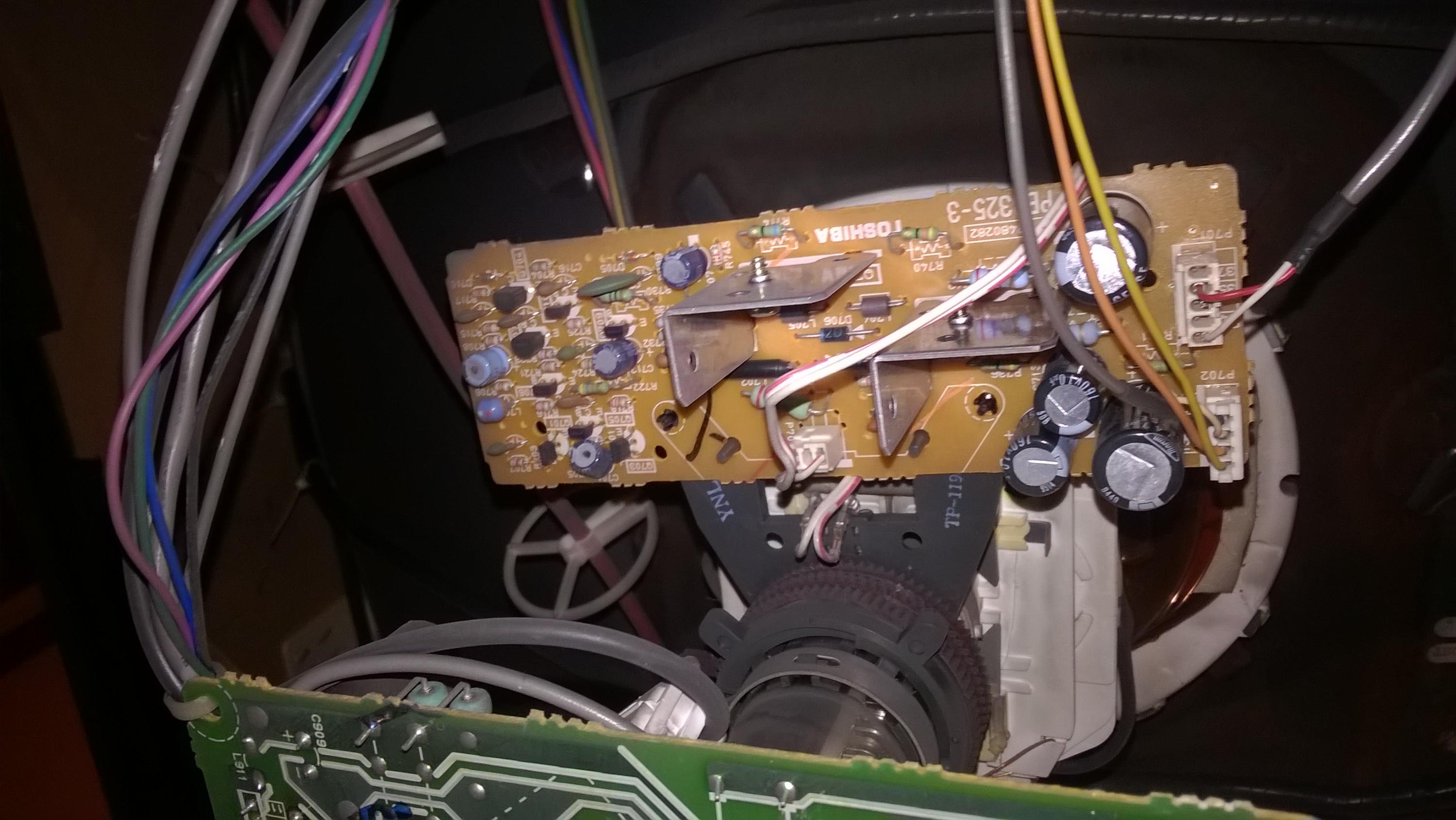 This is a late 90's 35" Toshiba crt, when its first turned on there is horrible pin cushion effects on the screen (see pics of menu, though it affects everything obviously). I assume there is a cap somewhere that has to warm up. What area is this cap likely located? board behind the electron gun? (I know nothing about crt's so just guessing)