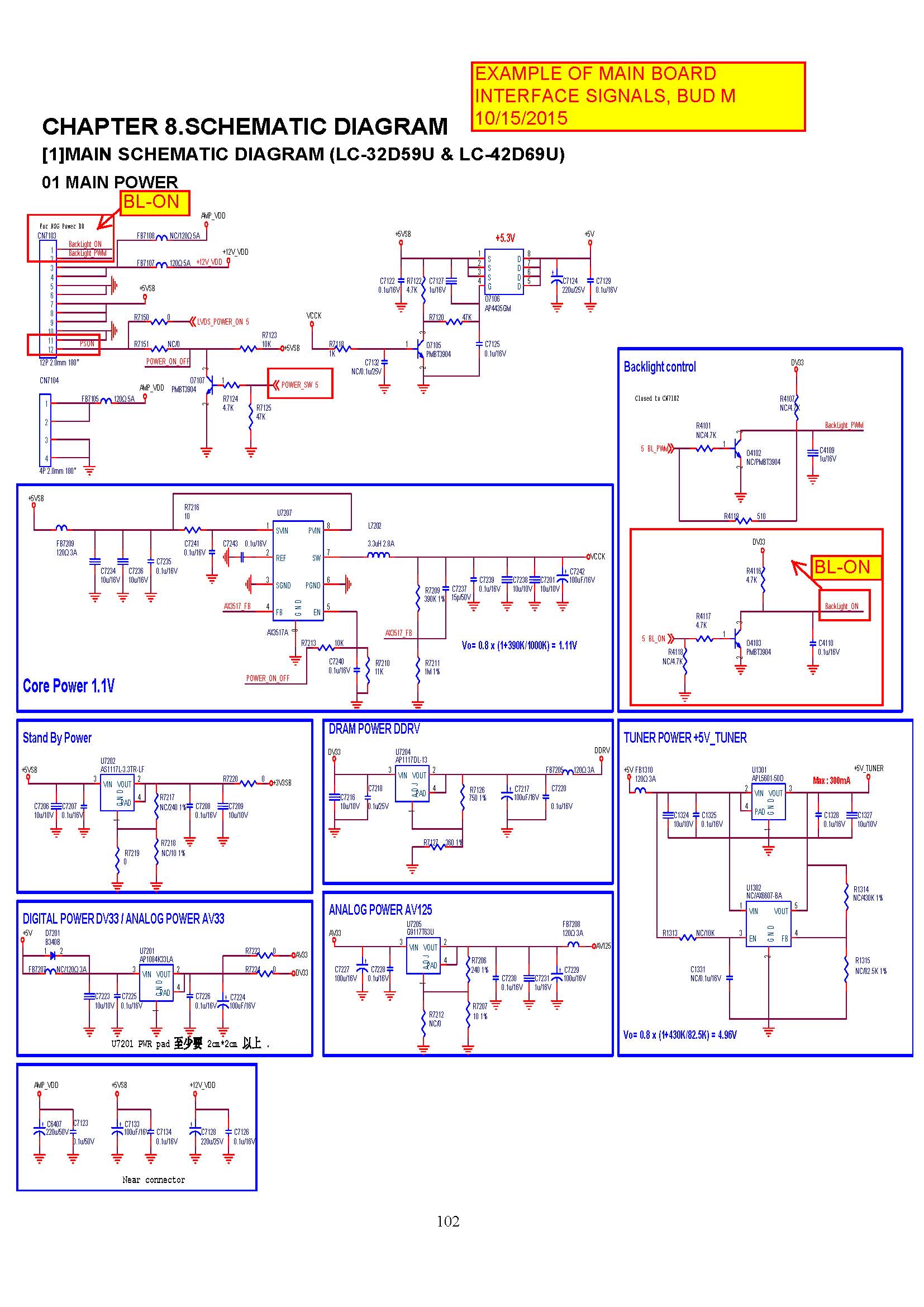 The LED Driver on/off pin from the main board is only giving out 1.0v. From another thread someone said this model needs 3.3v. Power supply is putting out all the necessary voltages.