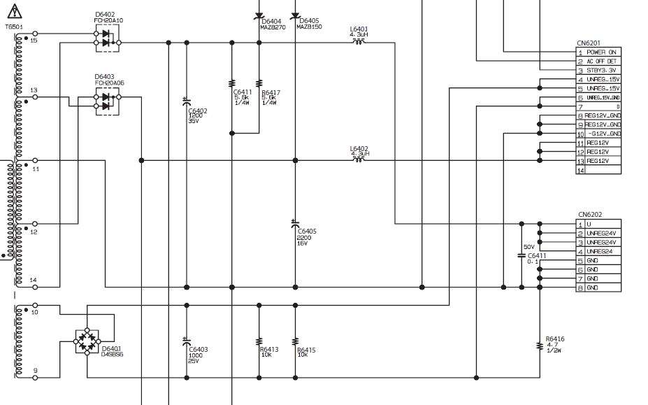 There's literally just a handful of discrete components to provide the 15V which is missing and I suspect R6416 may have gone O/C. The 12V is up and running so the DC-DC inverer circuit is working. There's not much left to check out. D6401, C6403 and finally but highly unlikely to lose the supply, R6413/5Attached Filesif you find these attachements useful please consider making a small donation to the site