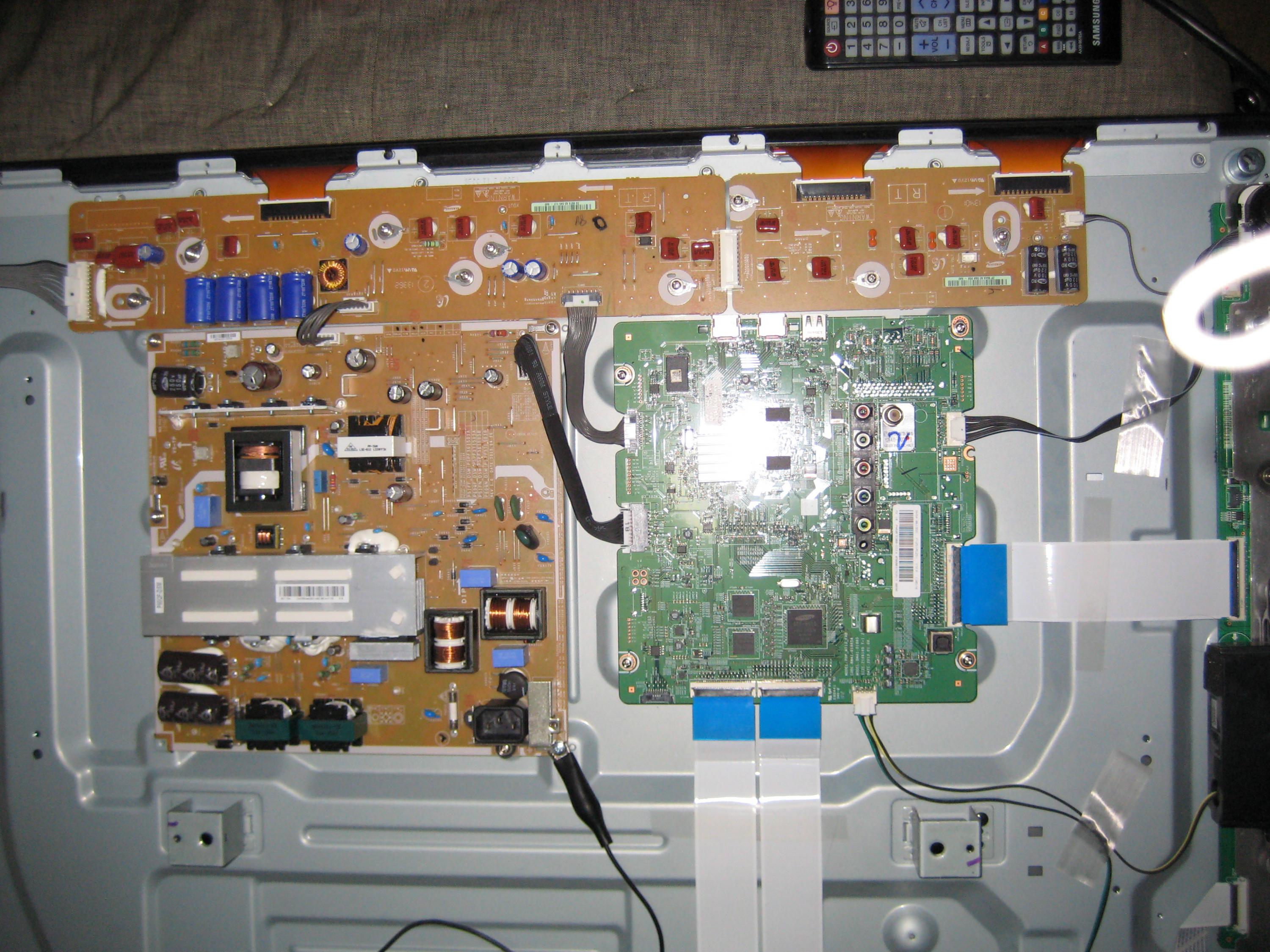 Trying to help out a friend with a Samsung plasma that quit working. It is only a couple of years old. I am not familiar with plasma TV's at all, but I have had some success fixing various electronics so I thought I would give it a try. He had replaced the power supply and the main board, but then gave up. When you plug it in and hit the power button, it turns on the red power indicator and there is a green led on the main board that blinks slowly. No picture or sound. I have not seen one of these operate so I don't know if there is supposed to be a startup sound or not.
