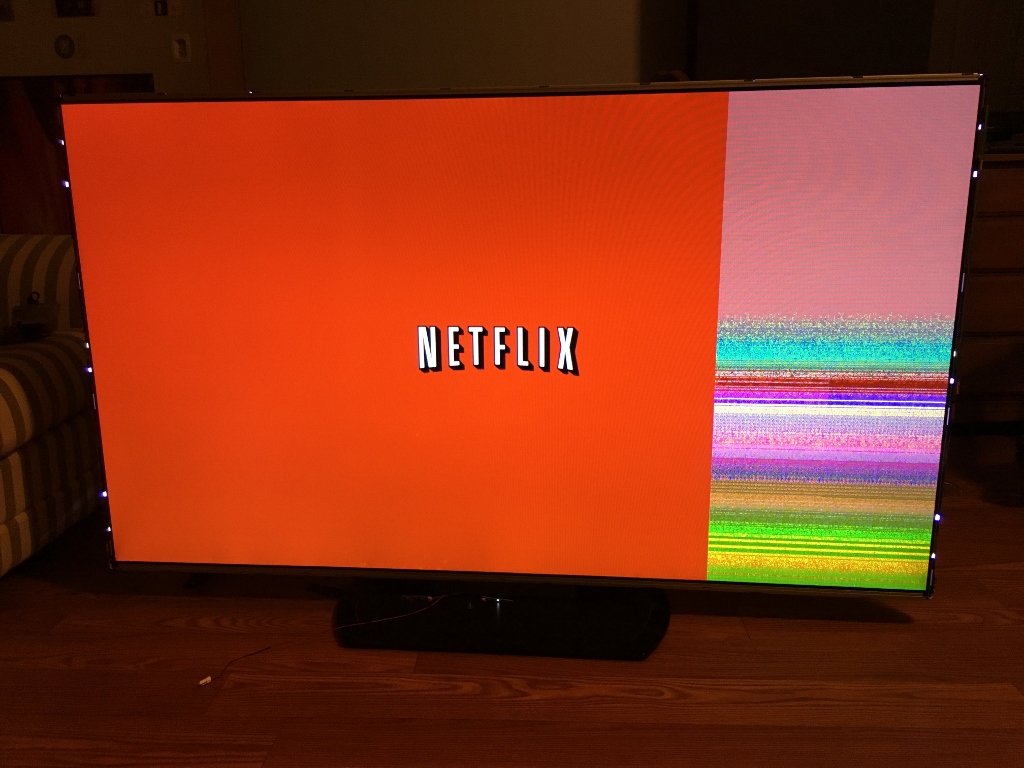 OK. I realized my earlier pictures were actually with with some of the right side interconnecting cables disconnected. The attached picture shows all of them attached with the netflix splash screen displayed. The right quarter of the screen is distorted.
