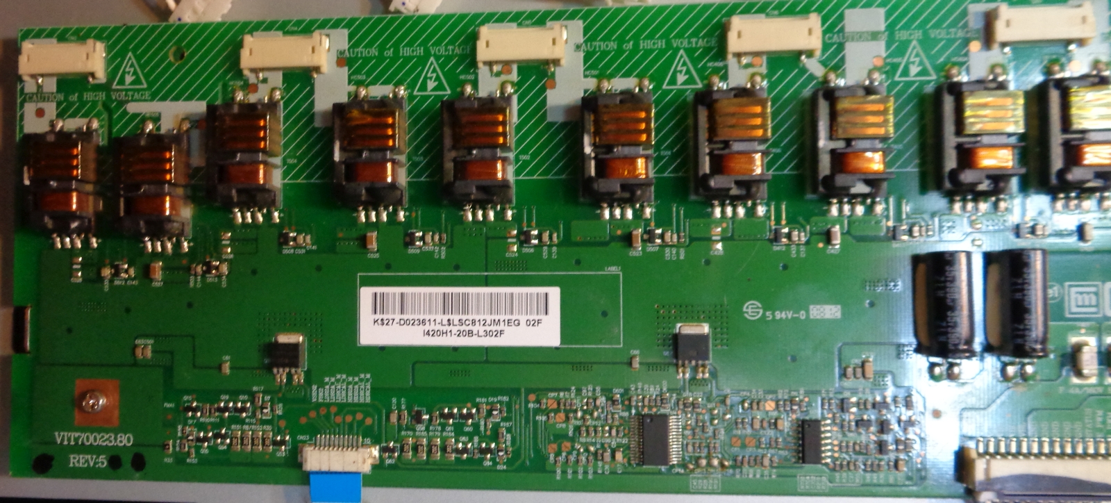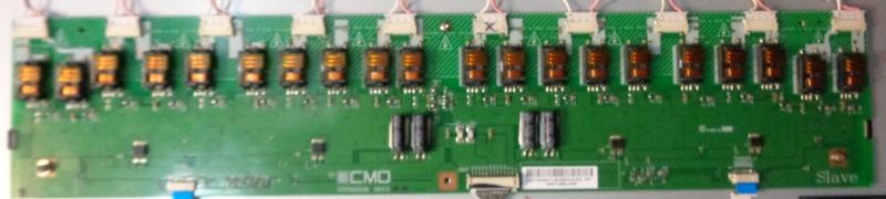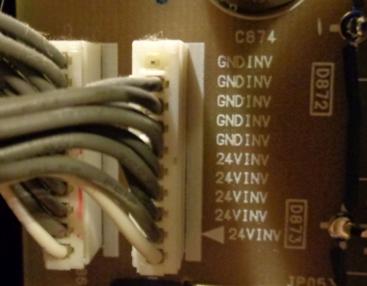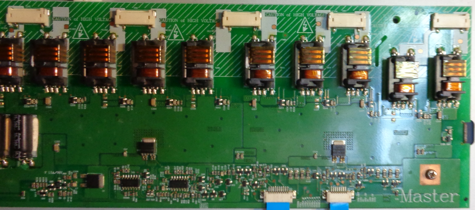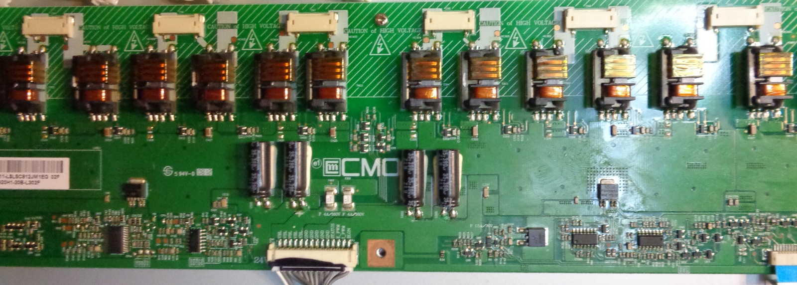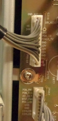 --TV comes on for two seconds then shuts down, then comes on again briefly and shuts down. Next time you have to push the power button (or the remote) twice to get it to start up as before. Green standby light will go out after a half hour if no buttons are pushed. I have tested each of the 20 CCFLs individually with a tester and they all light up. Also I obtained and installed another used slave inverter board, which makes no difference. I include below pictures of the voltage listings on the power supply board cables. I am standing by with an old Fluke 87 DMM, and a Sony Vario 20.1 Megapixel camera at ready. Your advice is humbly solicited.