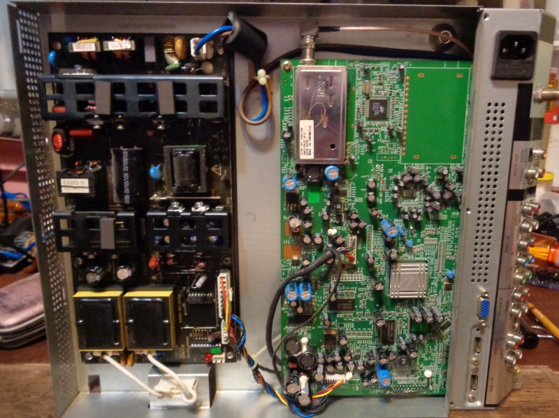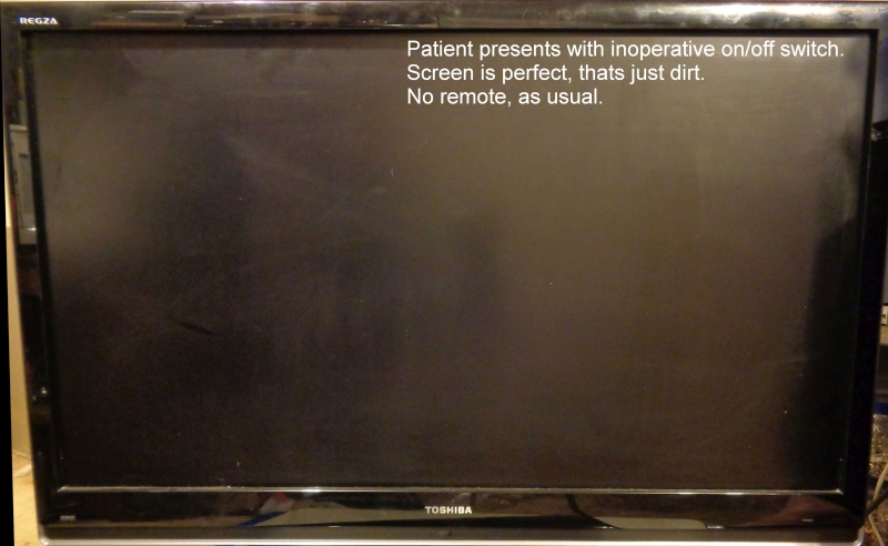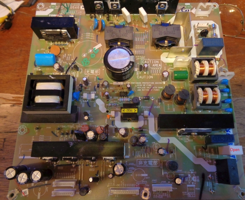 --Please see all the below pictures (800 x 600) which go along with the story and are in chronological order. This Toshiba Rezga 42RV530U was picked from the curb, and had no signs of life. The fusible resisor 1.8 Ohms was found to be open and was replaced with the new recommended 2.0 Ohm replacement. TV was working fine, so I swapped it to a friend for some automotive work, but after three weeks he brought it back with the shutdown syndrome.