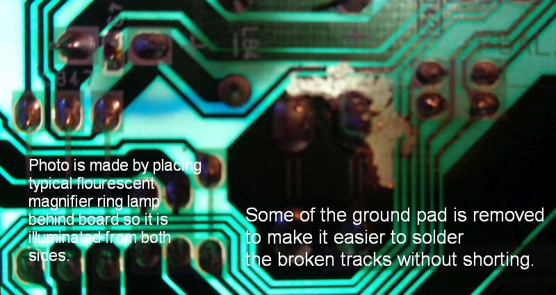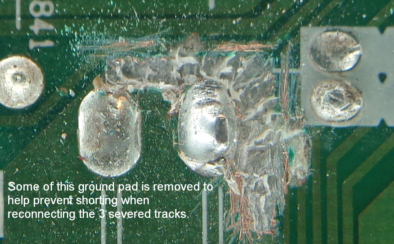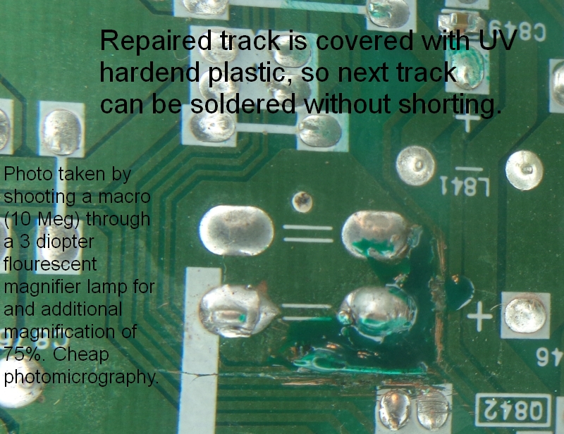 --In attempting to remove a component for testing, I invertantly damaged three tracks. Pictures with text explain the repair and a couple of photography tricks. In any case the tracks were repaired, and we are back to trying to fix the two seconds to black.