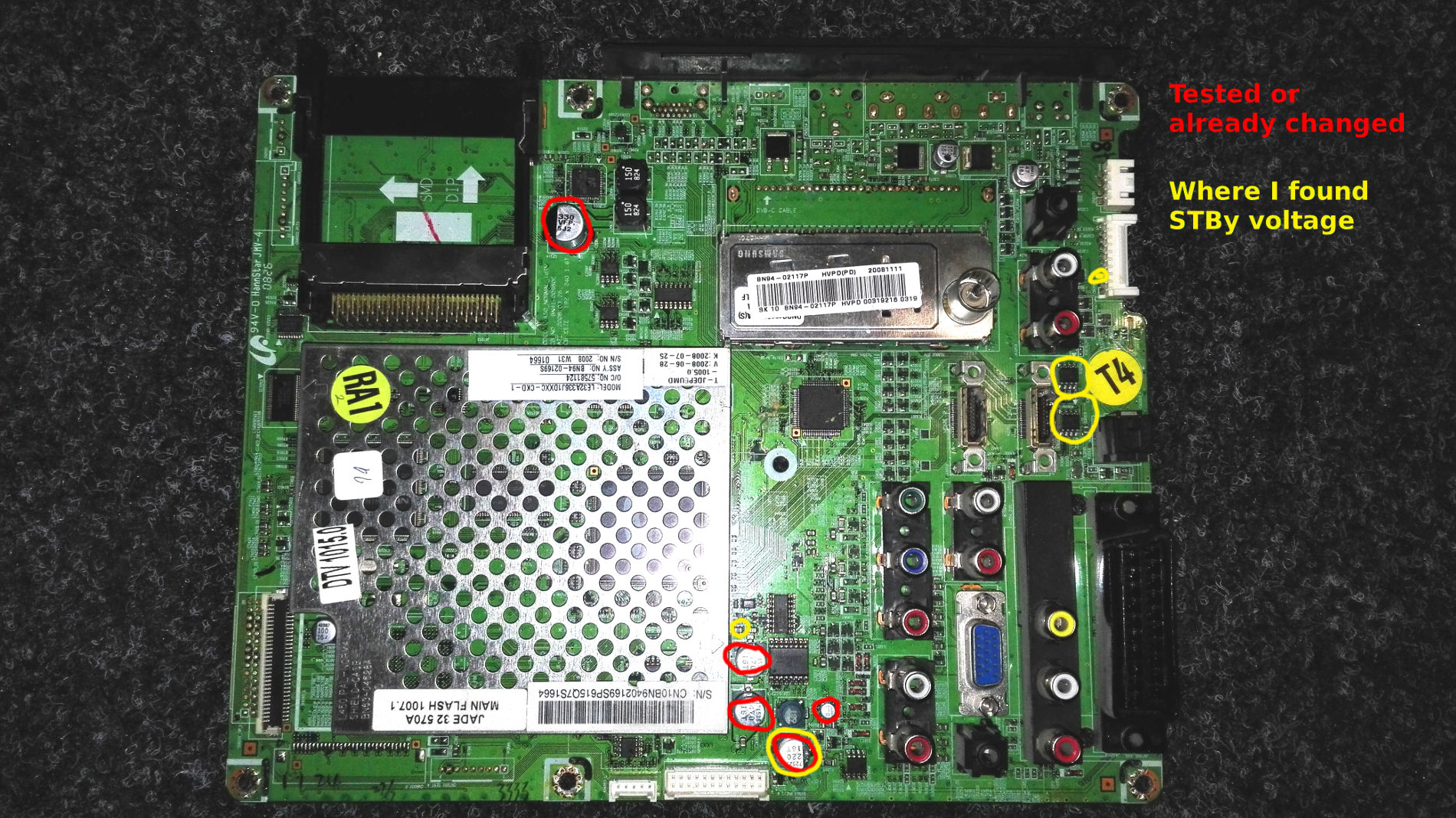 I have a samsung LE32A336. I am sure that a repaired whole PSU, because I tested all voltages on their nominal current. Everything's fine, until I connect main board, then StandBy supply (5.2V) started oscillation between 5,2V and 0 (it is a reason why red led blinking). I think, it is because on the mother board is shortcut, but I cannot find where. I changed all elites, but does not help. I am thinking about corrupted EEPROM, but it cannot shortcut supply, am I right? BTW, when I connect resistor between StB supply and ON/OFF pin on PSU, TV works fine, but it is not good way . Any suggestion please? Main board is: BN94-02117.