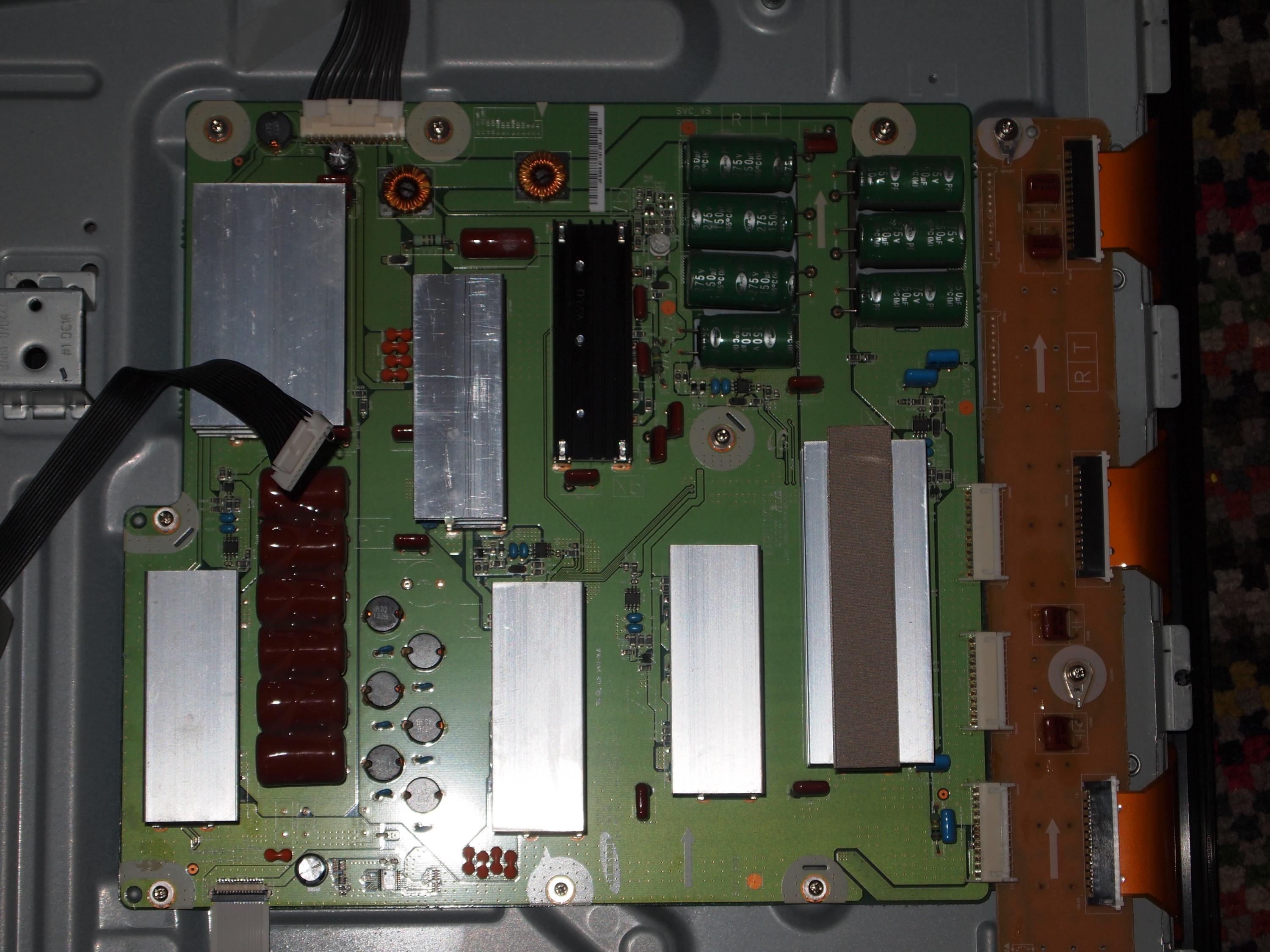 Got this Samsung PN59D530 59in plasma from a guy that said he had two of them that both got fried after a lightning storm. Both fuses on power supply check out okay. On the header that goes from power supply to main board, I am getting 5.3v for PS_ON and 2.7v for Standby, but no readings from any of the other pins. When I unplug the cable from the motherboard standby then reads 3.8v instead of 2.7.. I tried to jump standby and ps_on and still got no readings from the other rails, but I think maybe I am not jumping it right.