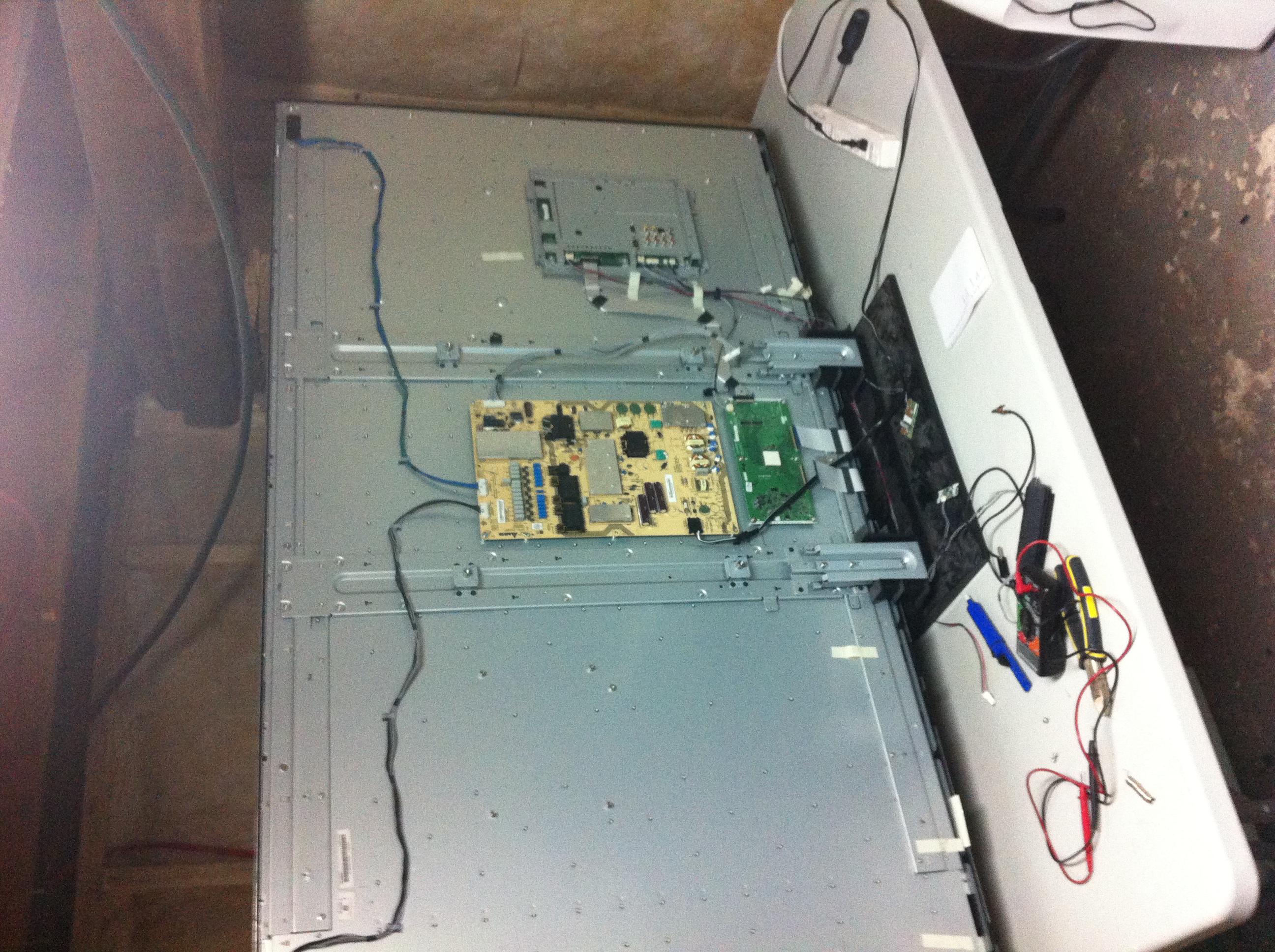 Now I must confess that I damaged the front panel when taking it off - who knew it was a bad idea to do so with the tv upright. I have disconnected the 2 big ribbon cables that connect to the TCON (if thats what it's called) board for all of my testing. I realize this TV will never be used again, and to be honest it's far to big for any normal house. But it does offer a great test lab to learn from.