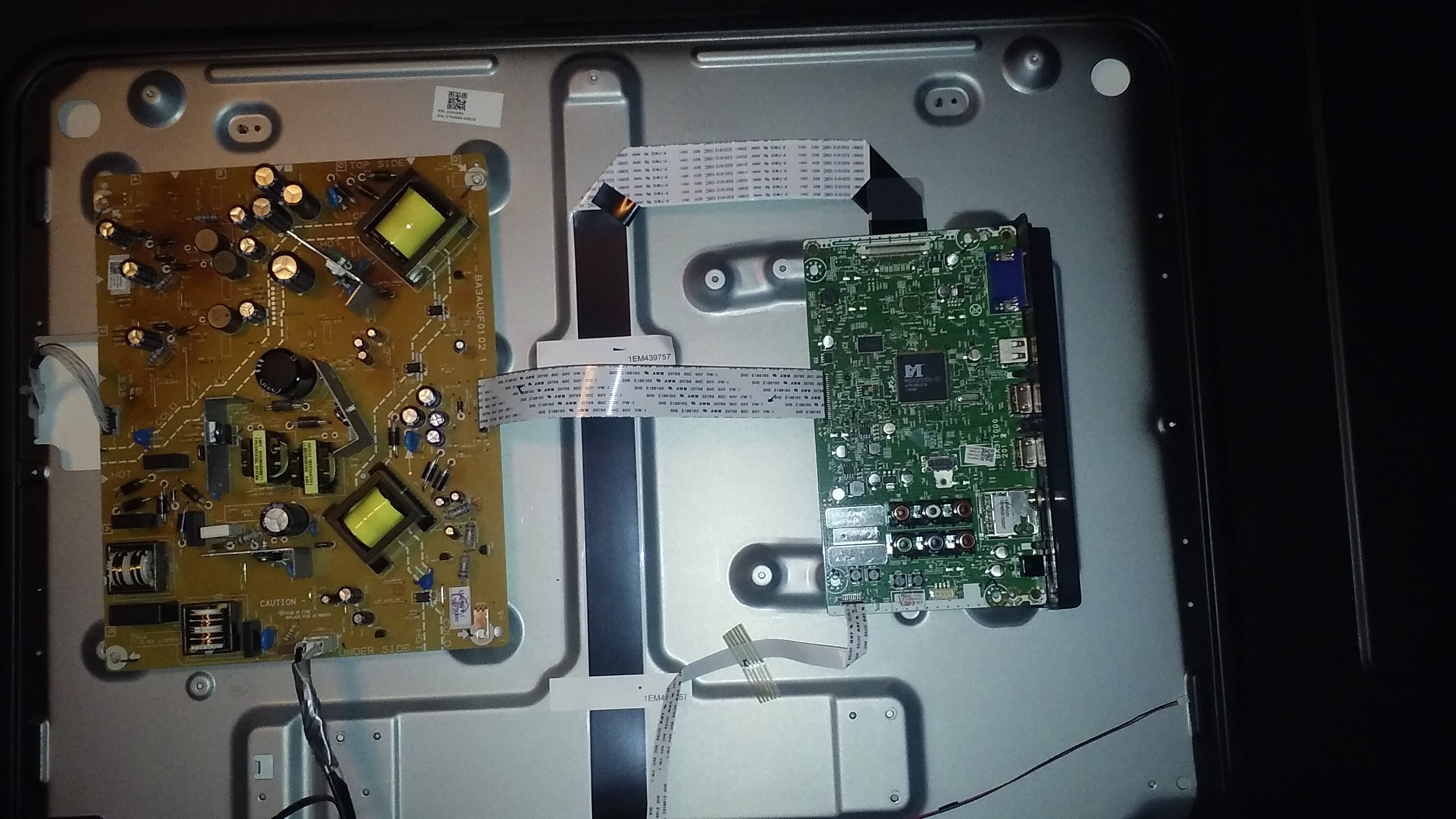 hello i came across this tv and am trying to get it to work i plug it in it turns on and the splash screen comes up (it says emerson) and then it kinda clicks and shuts off as soon as the tv should be displaying i can see the channel box right before it shuts off iv looked at power supply and all caps look good although there is some white crusty stuff on the big one that is below the 2 smaller transformers toward the bottom of the board. i have unplugged the ldvs cable with no change just looking for the next place to go there is some discoloration on the powersupply board on the top left and top right (where it says "top side"