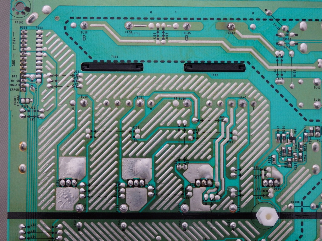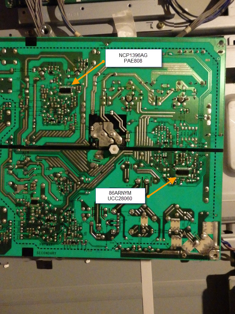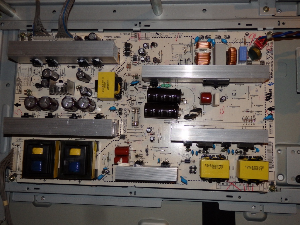 SYMPTOMS: At standby the front LED is solid red. When turned ON, it flashes brighter red twice, then goes out. From the inside of the TV, I can see the light change to blue but it is barely visible on the front of the TV. There is no picture and no sound.