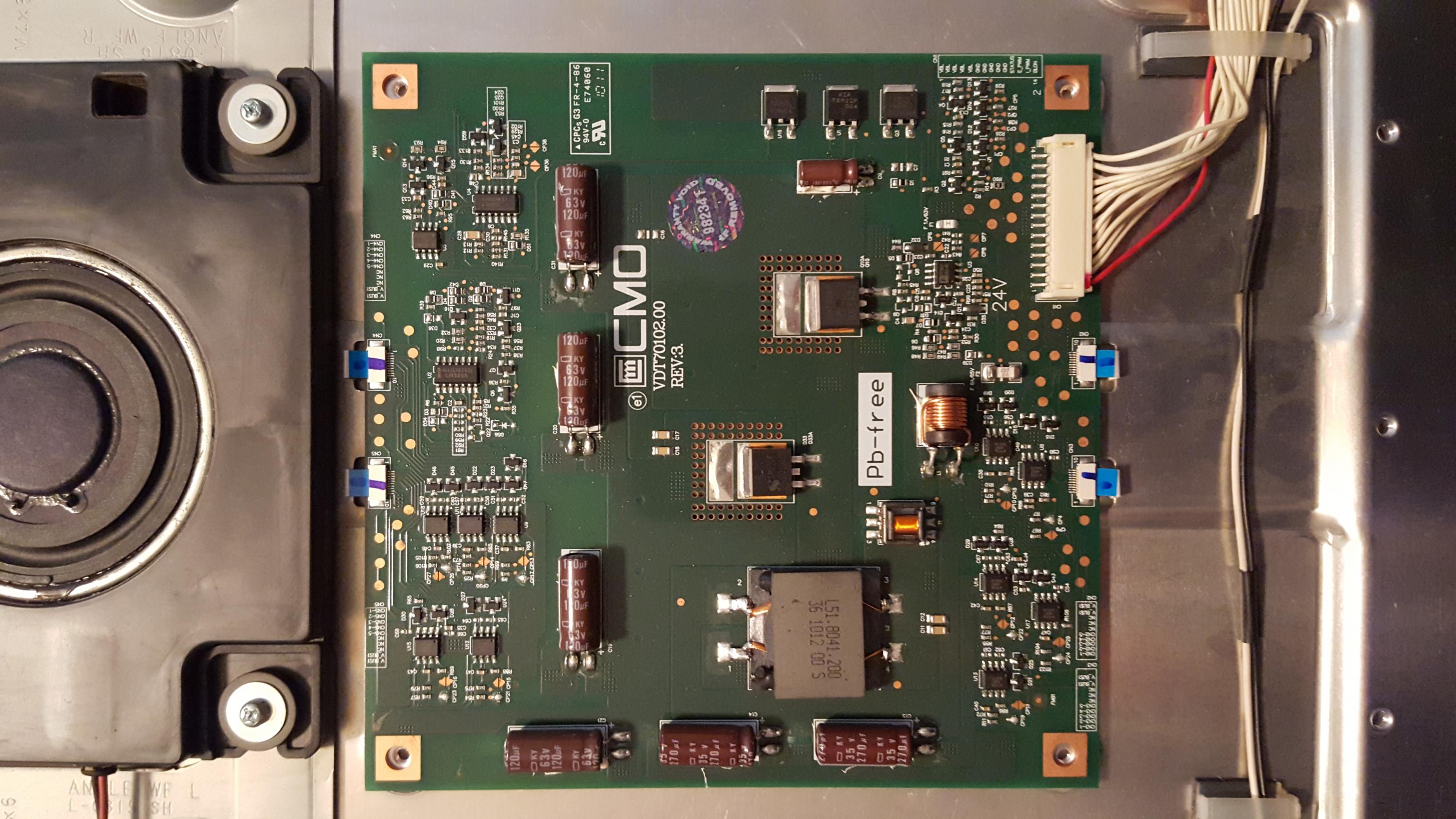 Ok, I have attached a picture of the back of the television. I am still stumped by what could be wrong with this tv. Ive tried changing out the power supply board with a cheap used one I purchased off ebay. That made no difference. I don't know how relevant it is but the backlight only will turn on for the short 5 seconds after the tv is first plugged in and cycled on. If I push power off and put the tv in standby and then power it back on, the indicator led turns blue but now it doesn't attempt to even light the backlight at all. I after watching some youtube videos agreed with the previous post and thought I had bad led(s). I tore the entire tv apart, exposing the leds, it does not have led strips like I had seen in the youtube videos but instead has four thin circuit boards with tons of LED's which are attached to aluminum bars running across the top and bottom (two boards on top and two on bottom) I hooked the power switch up and plugged it in and observed the leds, when they turn on, all of them are lit with the same intensity which is very bright and none of them are out or dim. I tested voltage at the backlight inverter board and it has a constant 24V regardless of whether the backlights are on or when they go off. Could one of the other boards be bad? What board tells the backlight to turn on? Any thoughts or ideas are greatly appreciated!Comment
