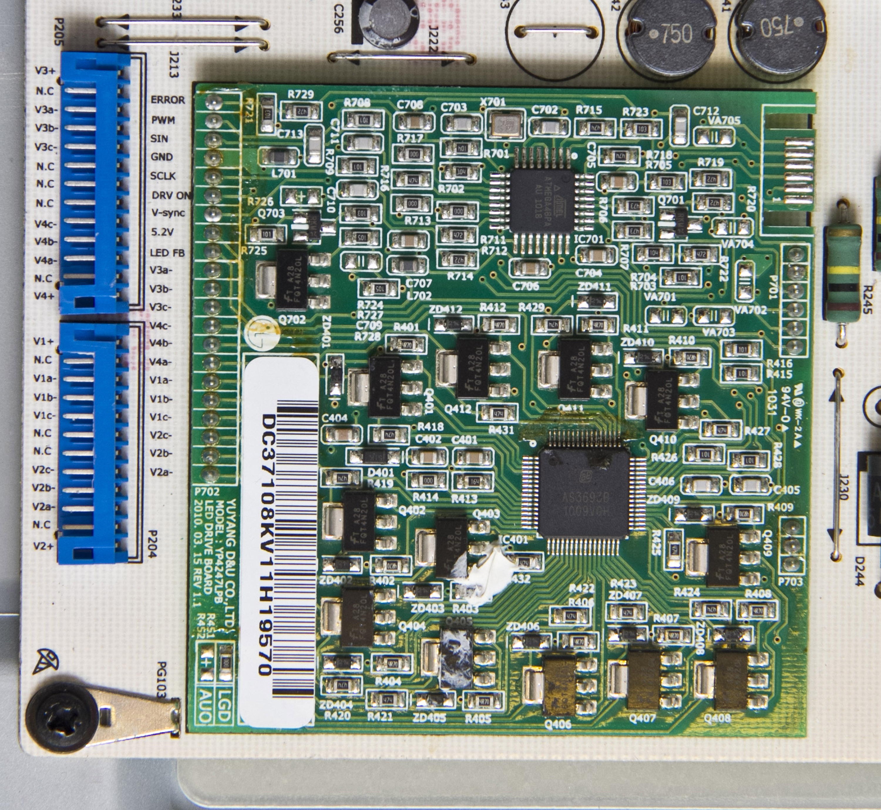 Caps look OK and diodes read OK on the PSU. Moving to LED driver board. I do get a 3.3V on the 'ERROR' pin when the back-lights turn off. 'DRV ON' pin remains at 3.0V at all times when PSU is on. There are 13 mosfets on the LED driver board. When the relay click on, the output voltage spikes to about 36V (I have no min/max) and immediately starts to drop until back-lights come on, then they read 0V. After back-lights turn off, the voltage again spikes to about 36V and settles anywhere from 9.2V to 10.8V on various mosfets. The V1+ through V4+ continually read 98.9V when back-lights are off or 105.5V when they are on.
