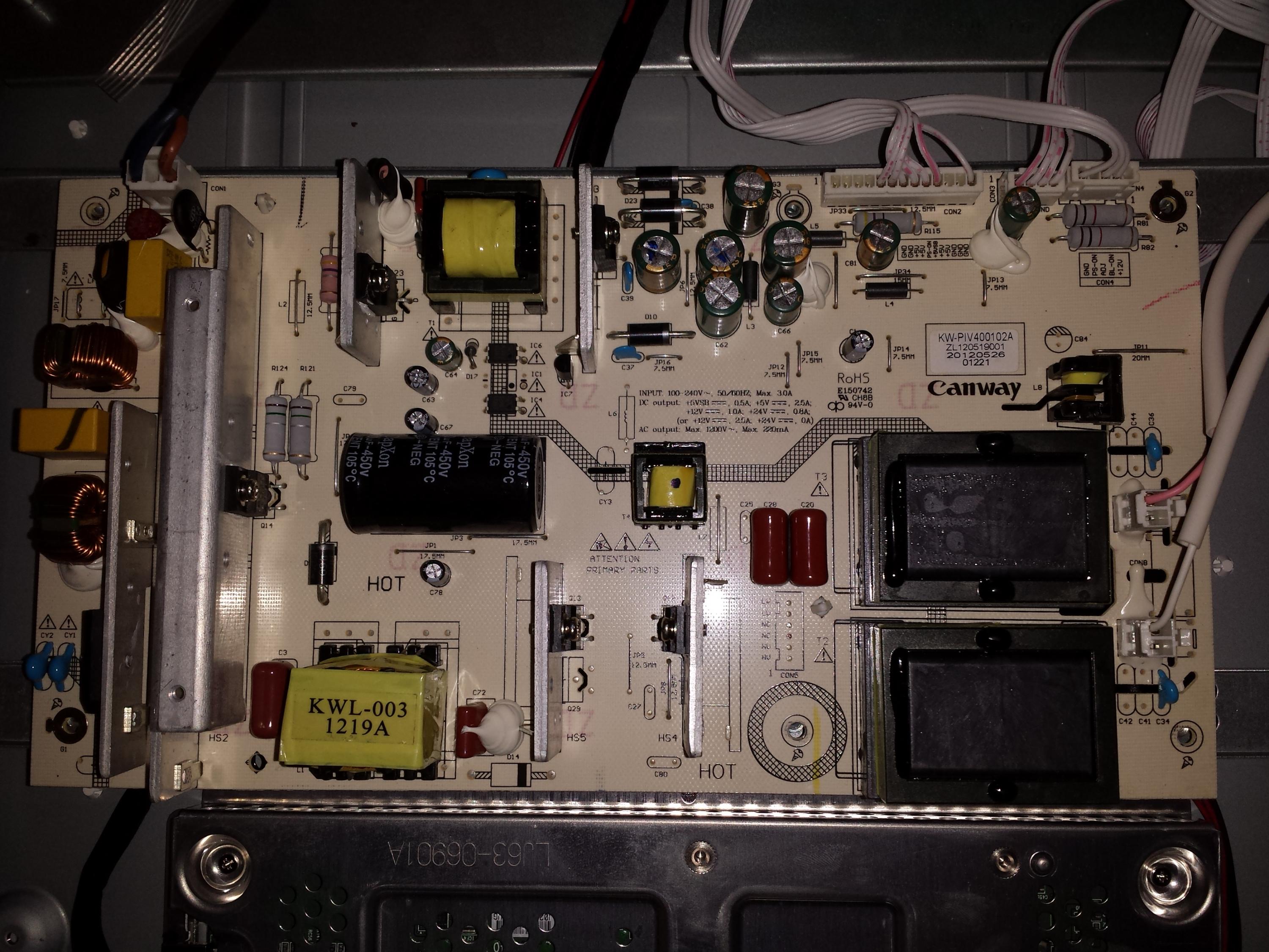 My sceptre lcd tv picture picture failed recently. The red light on the front doesn't come on and I understand from the troubleshooting guides that something in the power path has failed. I found an old thread on this tv that I will go through in detail, but I wanted to post a picture that shows some suspicious looking caps first and get an opinion. I don't have a setting on my phone camera that matches the max resolution so I picked something that was closest. I hope that is ok and appreciate any help. The caps in question are 4 on the right side of the picture ( the board is actually show upside down). The tops are grey instead of metallic silver, so I wonder if they are bad. I'd also appreciate info on where to find board schematics and other technical info for the tv.