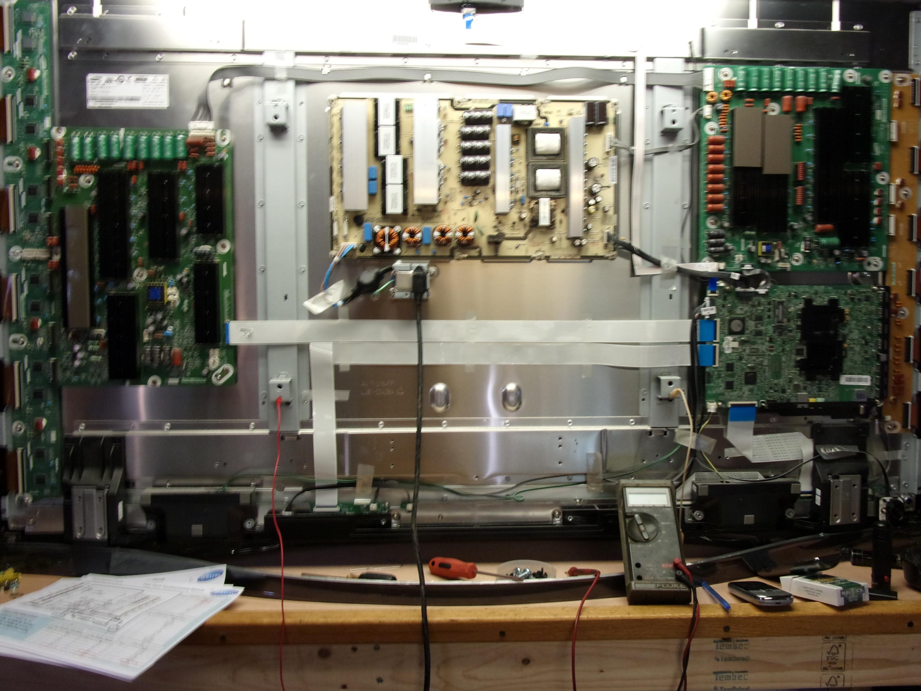 Hi Guys! Working on this 65 inch Samsung. It's my dentist's so it probably sees a lot of run time. It isn't turning on. Checking vs,va,vsc, and ve. The voltages are there at first and it must be going into protection. I am using Samsung fast track guide for reference. I found that if I unplug Y-Sus board that I have the voltages there which rules out SMPS problems. I have no boot melodies or picture. I tried unplugging buffers and this had no change. The led on the main board acts funny. With the boards all plugged in the led comes on but then starts to fade and then nothing. With y unplugged it acts normal and I can get a click with pwr on on the remote and then have voltages. Also there is no test jig that I see on main to activate the power and logic test board patterns. Thanks for all the help over the years. This is my go to with unsolvable problems. This y board is very pricey. Some of these parts are nla. Funny built in 2013 march.