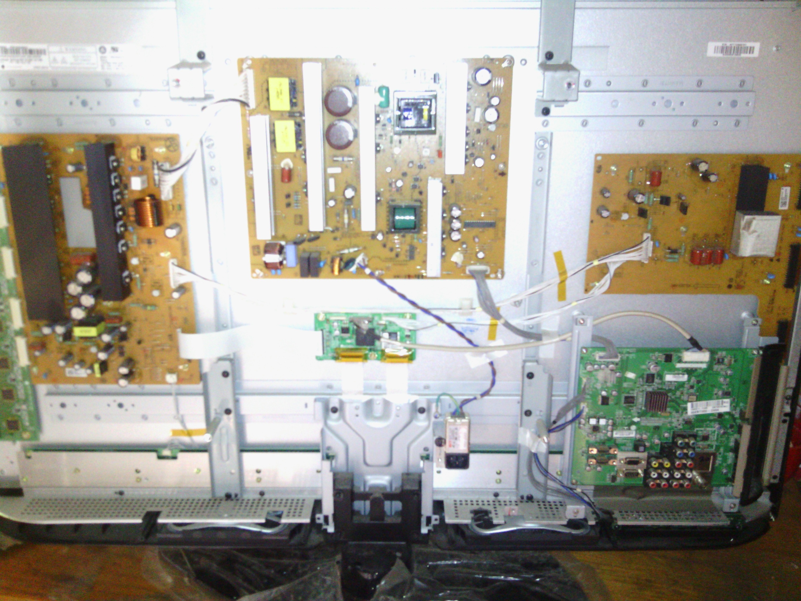 I've posted some dodgy pictures of the overall layout of boards in the TV, and a close up of the power supply. Visually all looks OK to a quick glance. I've circled the cap that in other similar power supplies often fails and causes similar grief to that which I've described.