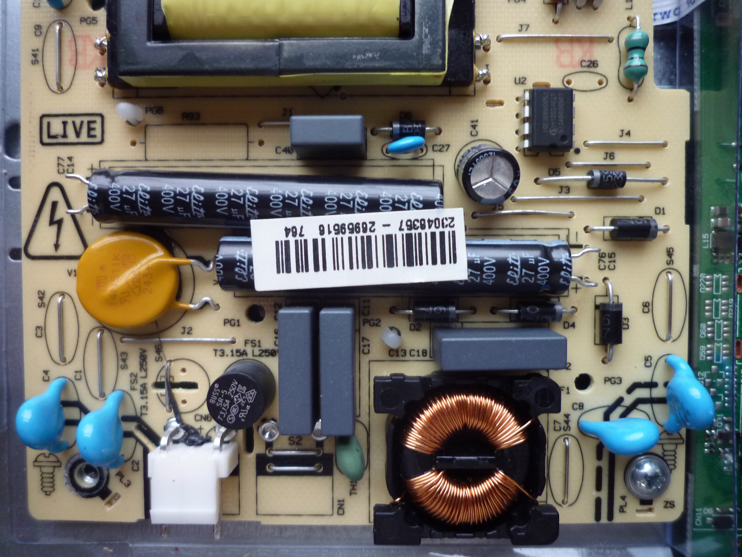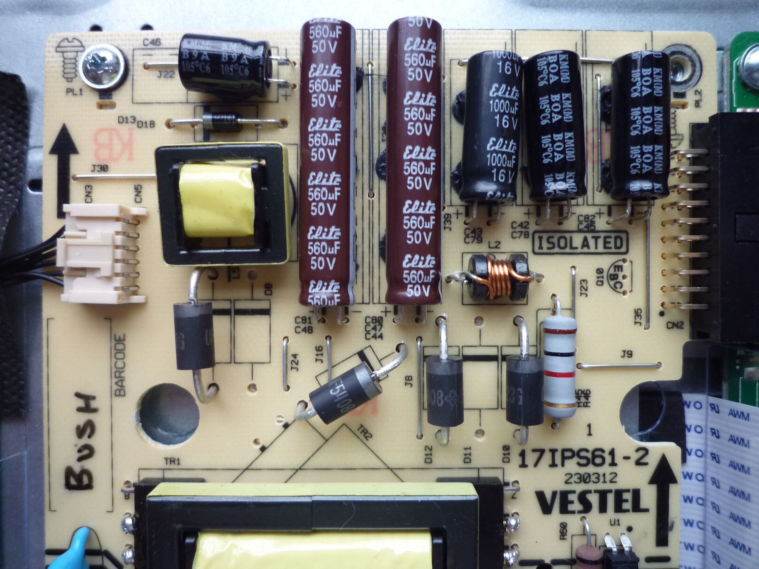 Hi, have this BUSH 22" TV that has no standby light, no image or sound. Have replaced bad diodes - D9, D25, D12 and D10 using UF5408, all new from same batch. Have 240.00 VDC coming in, fuse ok, 96.0 VDC across both sides of V1 (14N511K) Voltages stable (11.28 VDC) on D25, D12 and D10, voltage fluctuates on D9 - 24 VDC to 28 VDC? Checked caps in circuit with ESR, all seem ok?