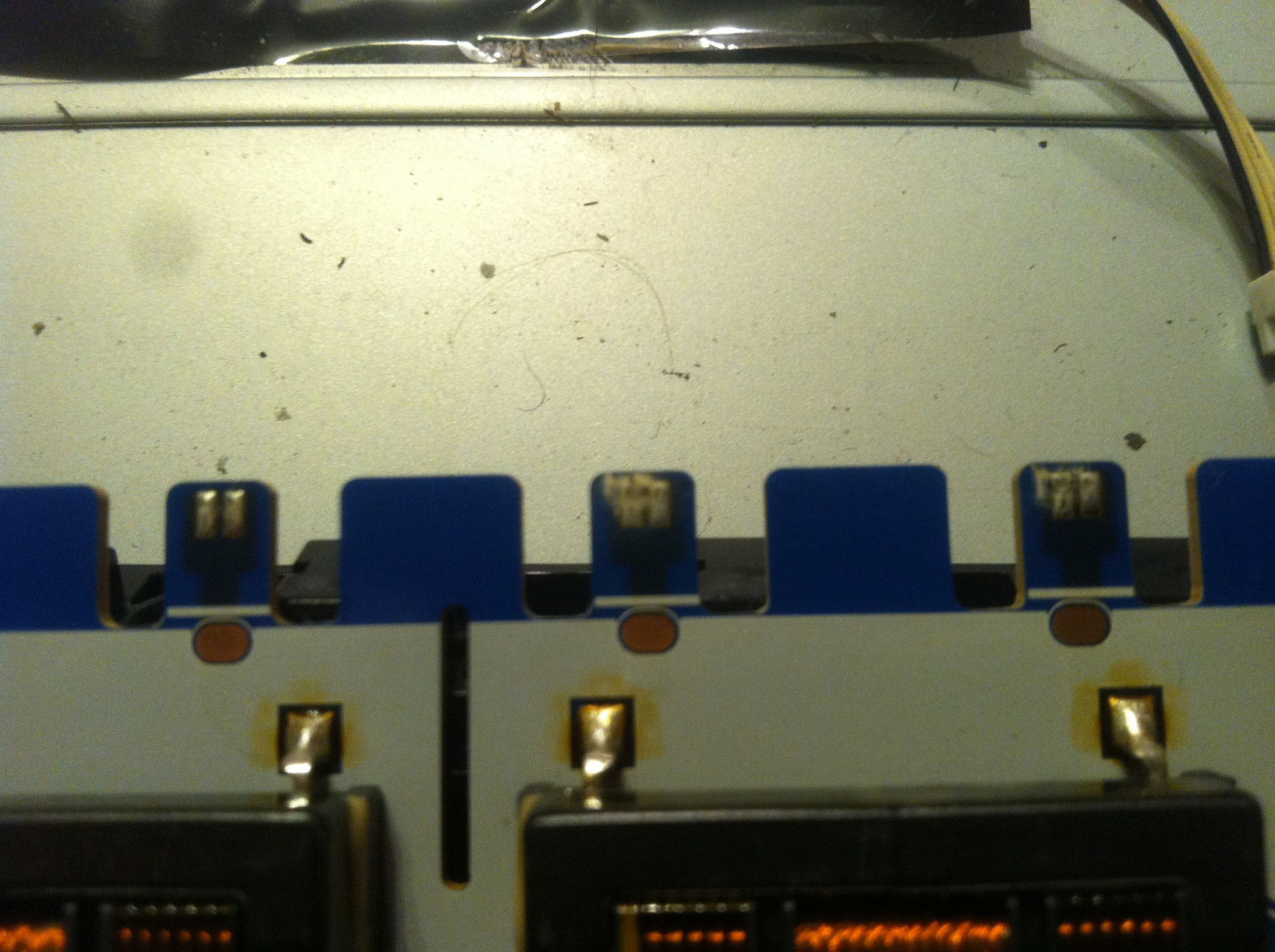 Well I gotta admit for my first time taking apart a panel that was pretty cool. The video you referred me to was excellent. When I pulled the inverter I noticed some kind of oxidization on two or three of the tabs. What would that indicate? The back of the inverter was discolored on one end of it like it got pretty warm. Picture are below. I took some closeups of the CCFL tubes on the ends. You can see small dark circles. The tube holders looked like they were clean. Would i have test the tubes to know if they're burnt or not? I'm not really sure where to go from here...and still wondering why I have no 24V on the power board. Would the oxidized inverter tabs have anything to do with that?