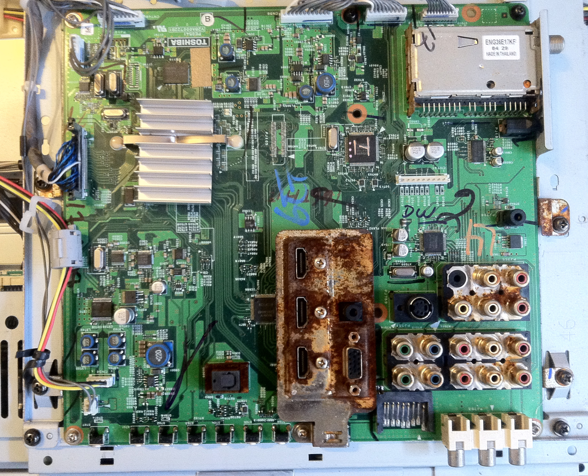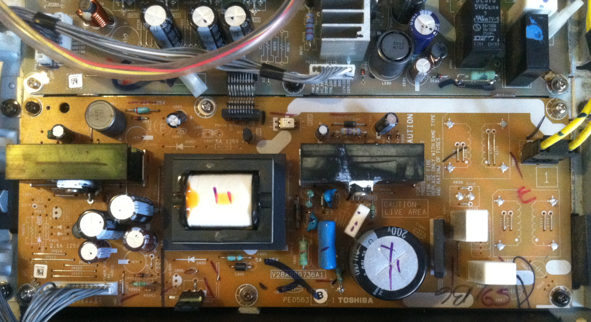 I was given this Toshiba 46xv54ou LCD which must have been near the beach here in San Diego because all the fake stainless rusted. When I plug in the tv the yellow standby light flashes 1-2-3 and does that three times then the green power light comes on. I hit the power and the relays click loudly and a nice full picture flashes on (i can see the menu for a sec) then goes out and then flashes one more time and goes blank. You can hear a faint buzz and see the backlights during the flash. No obvious fried or bulged parts. i replaced the charis board because the rust had done a number on it however that didn't fix it. The Tcon and the inverter boards are in fairly pristine condition and I did not take them out so far. I checked voltages on the power boards where they were labeled and the bridge rectifiers. See the diagram I made below. The pin labeled 24v had a zero reading. I took pictures of the power and main boards front and back. Hopefully you all can help me sort this out.