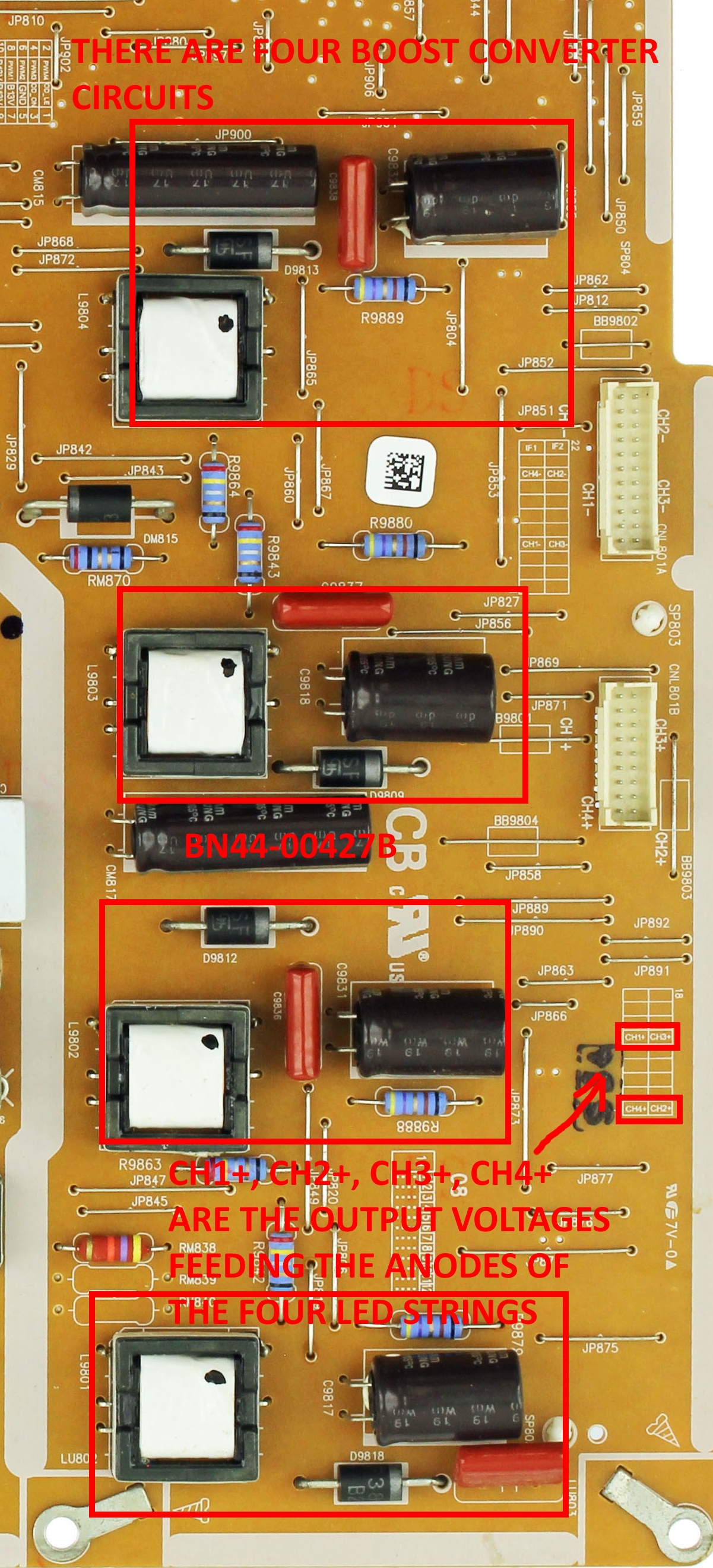 The drivers has 4 boost converter circuits to feed 4 stings of LEDs.