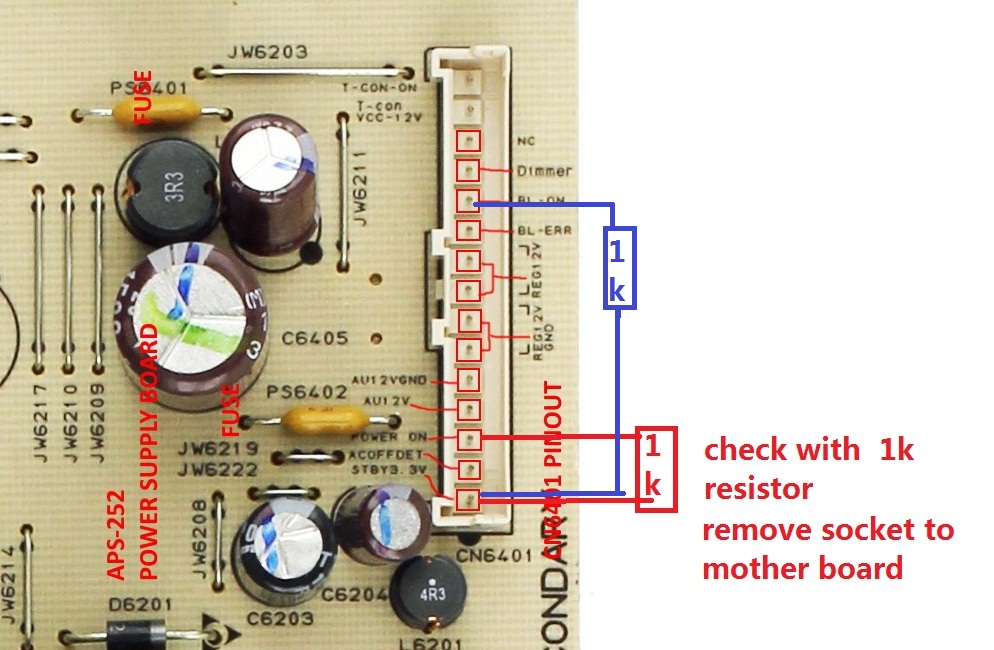 What is going to happen with the two forced on resistors installed is that when you apply the main AC to the TV BACKLIGHTS should come on and stay on, and the DCV Between the legs of the main filter cap in the hot side should be closed to 400VDC.