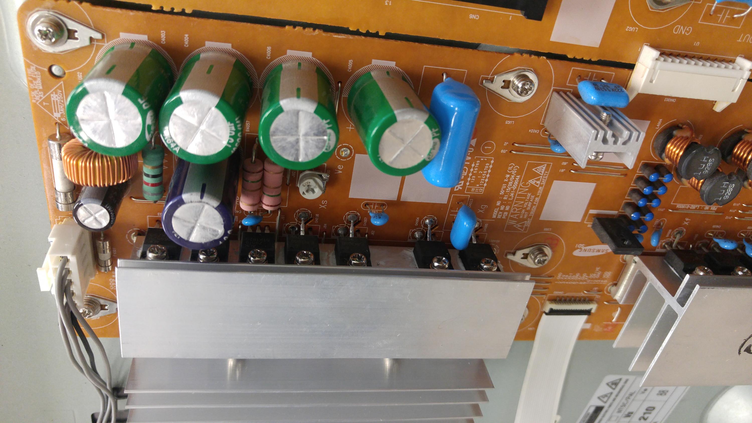 I turn the tv off, make sure the power supply clicks off, unplug it, wait a bit, plug the panel in, and boot it up. Fizzing/loud sounding discharge coming from that Xmain area of the set, and pop. IGBT's all short to ground. At this point, I think bad Panel. However when I redid the xmain repair, I did the same thing and didn't plug in the panel, so the tv stays on and you can see a partial crappy shadowy picture which makes me thing panel is ok.