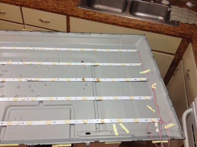 Going into the tv from the back, the two boards (PS and main) and associated wiring are on a single pressed metal panel while the red/white LED cables are bundled and go into a hole low on the metal panel. Same for the video cables. It looks like if I remove all back-panel screws and lift it off, I should be able to get to the LED strips on the back of the metal panel and then check directly.