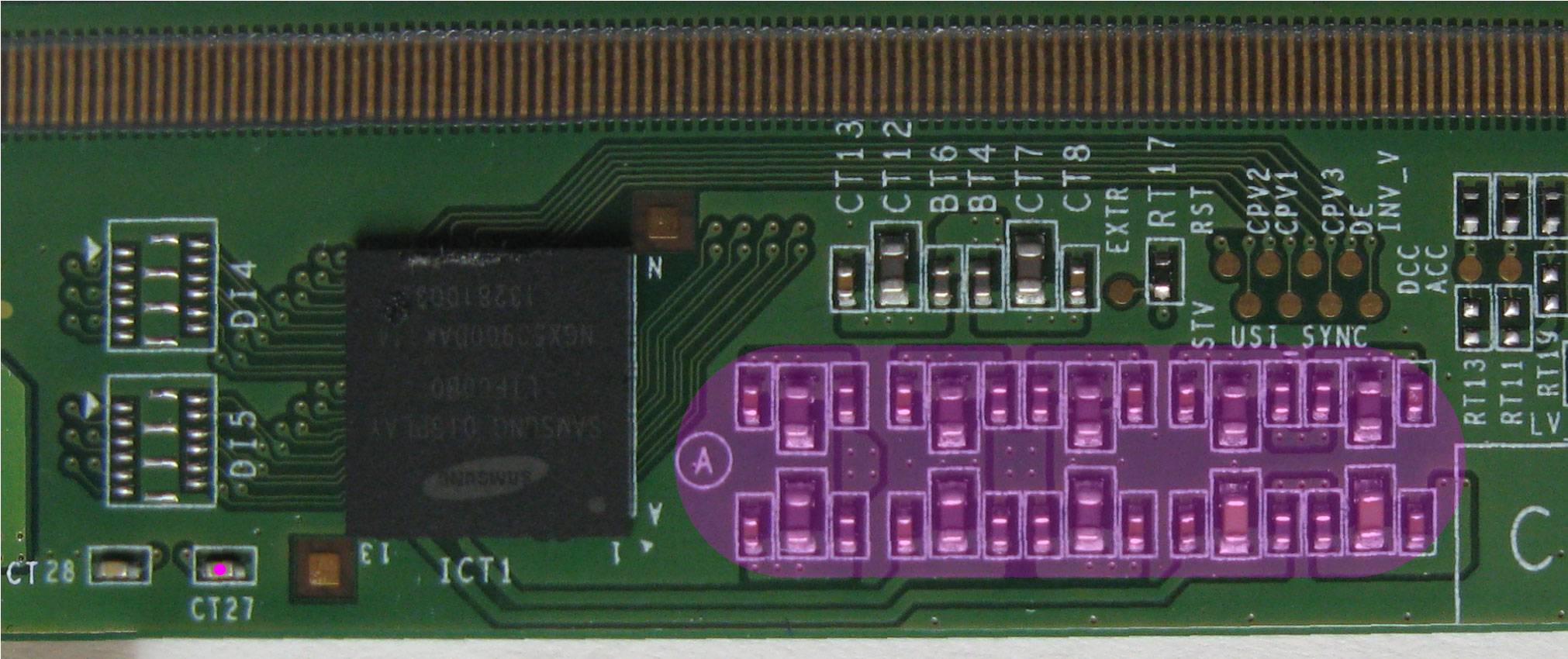 The attached image shows the TCON board on which i marked interesting testpoints in red. When TV is powered on, these testpoints measure: