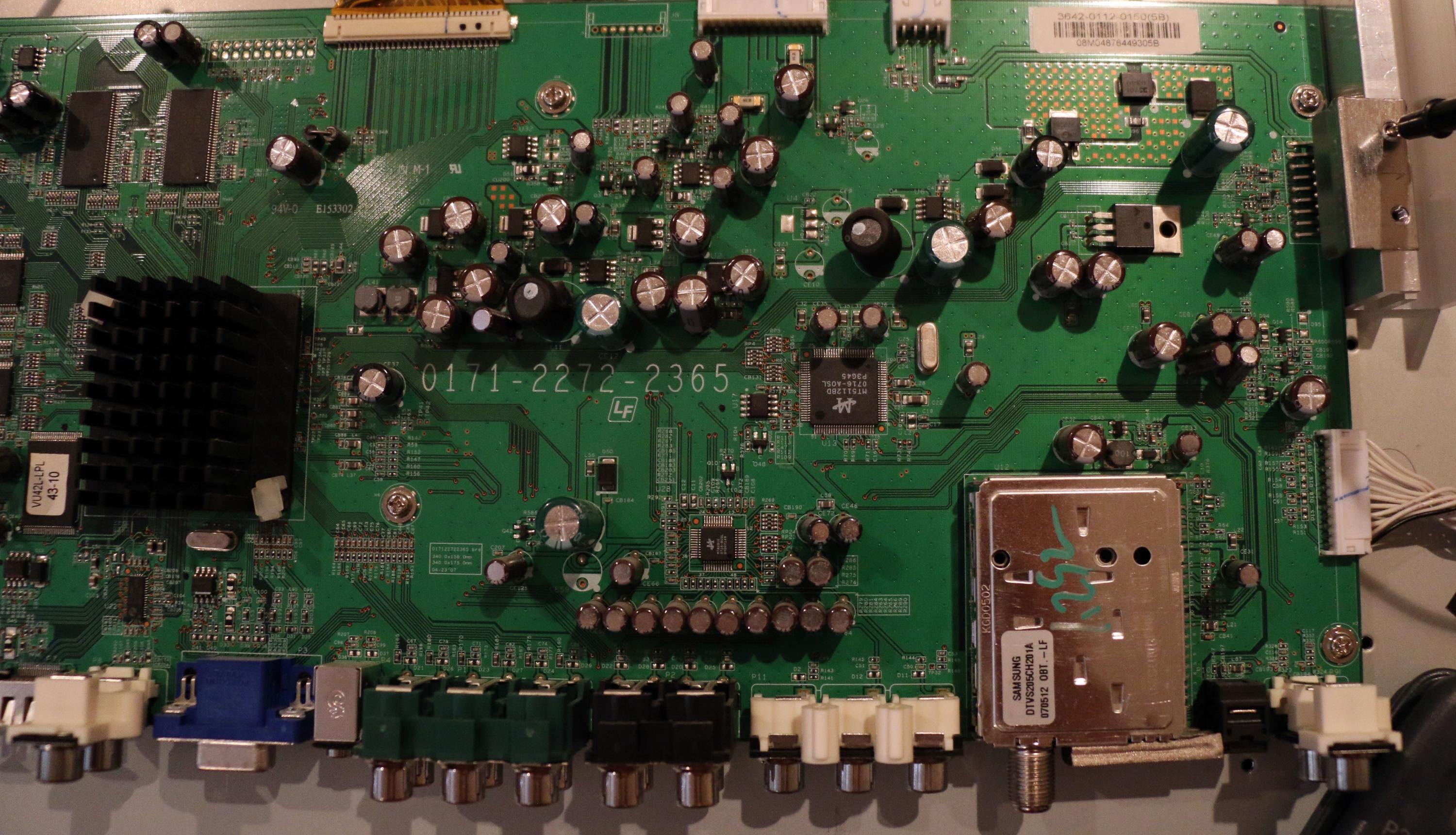 I have a non-working Vizio VU42L FHDTV10A that an acquaintance gave me. When plugged in the Vizio logo illuminates orange, but the TV does not turn on when you press the power button (logo does not turn white). Attached are pictures of the back of the TV, the power supply, and the main board. I took 2 sets of close-up pics of the main board because the first one had flash glare (though the rest of the PCB was easy to read), so I took another set without the flash. Hopefully you can get what you need. If not, let me know and I will take more photos. After reading a lot of posts in this forum regarding similar TVs, I believe the problem is in the main board, so I've tested the voltages coming off of the power supply and all of the voltage regulators on the main board. Here are the results: