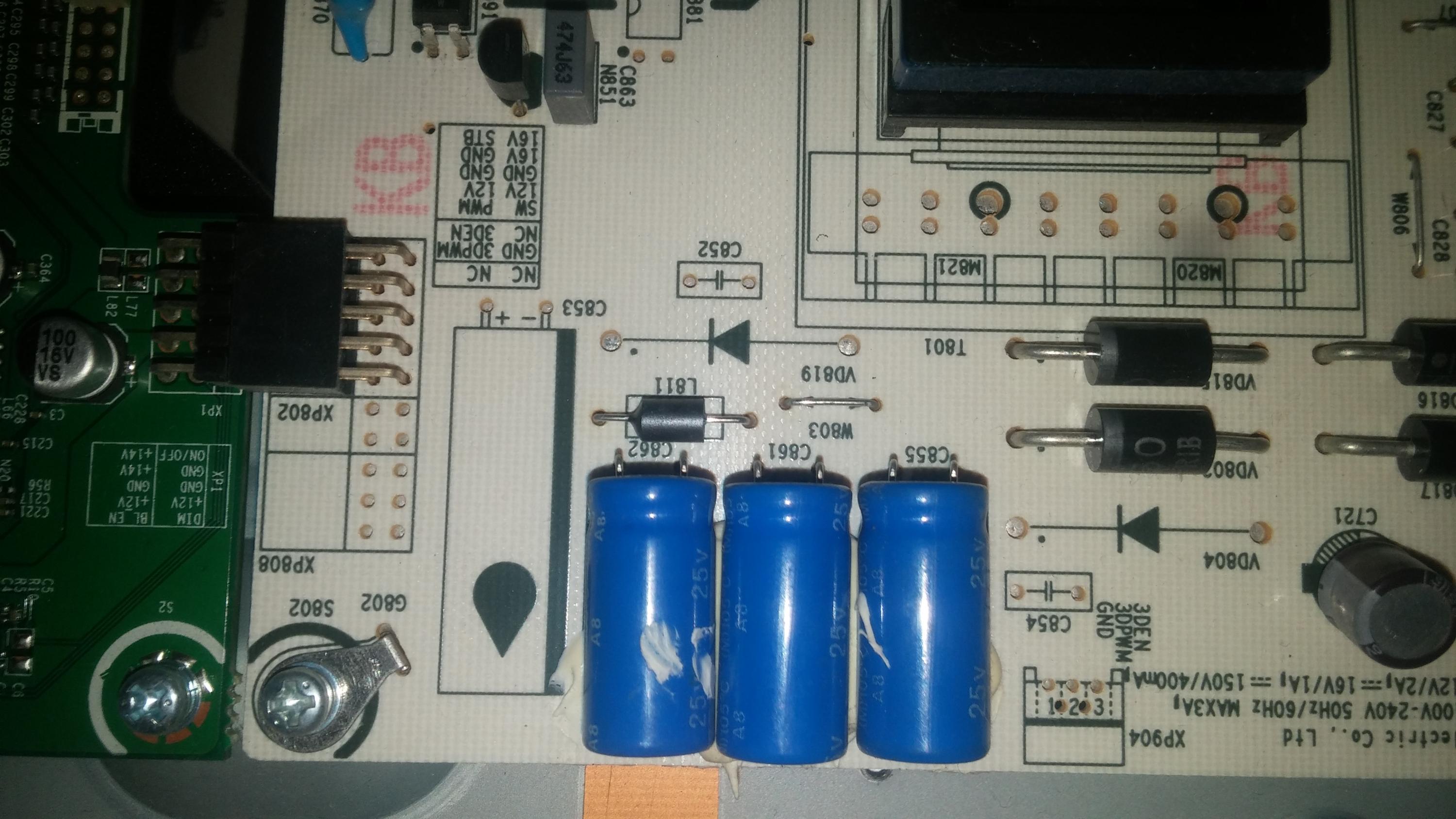 5VSTB is present when the set is off. When turned on, 12V are present, SW >4V. No sound, video or backlight. The STB LED blinks 6 times, then goes off.