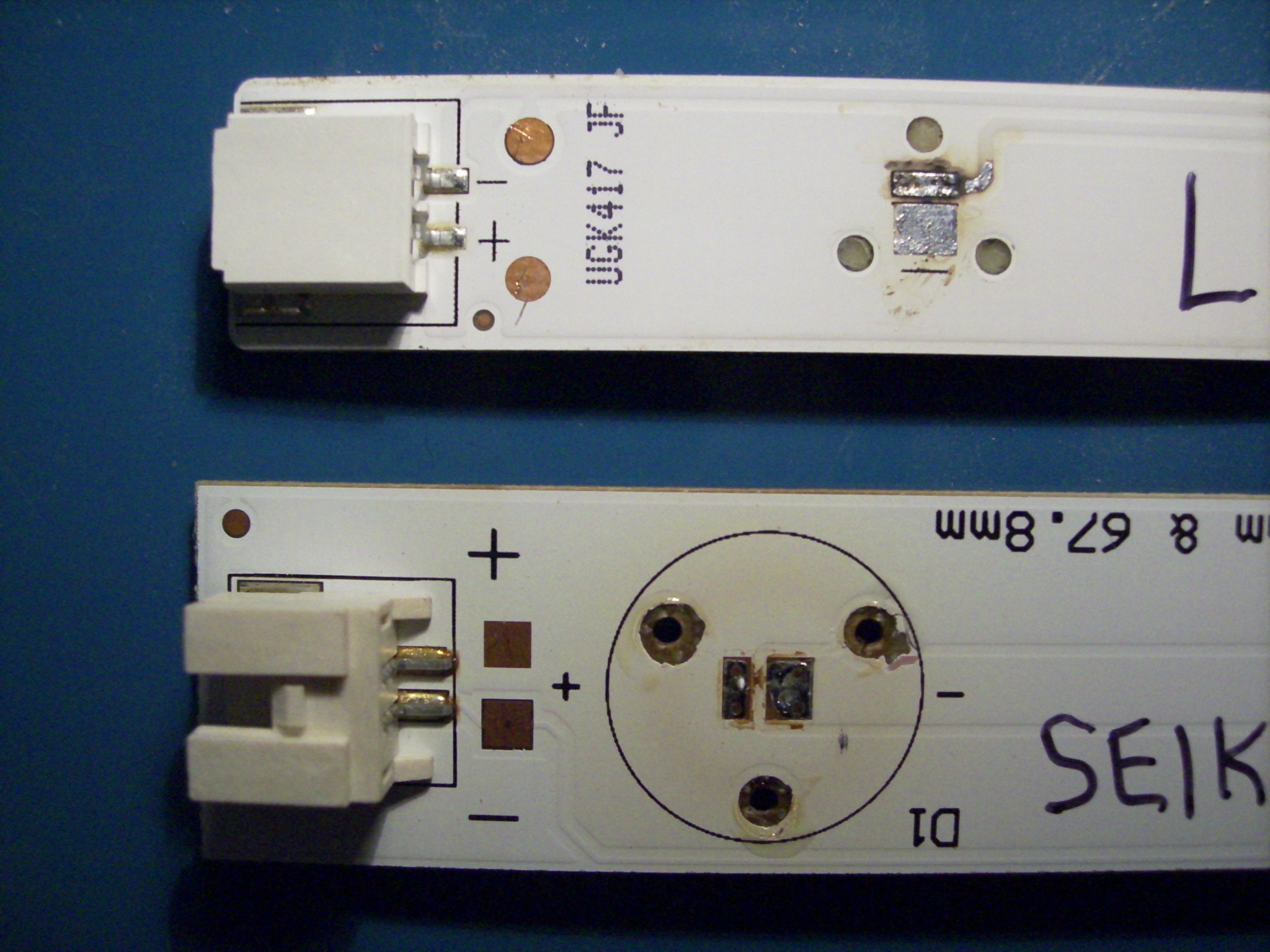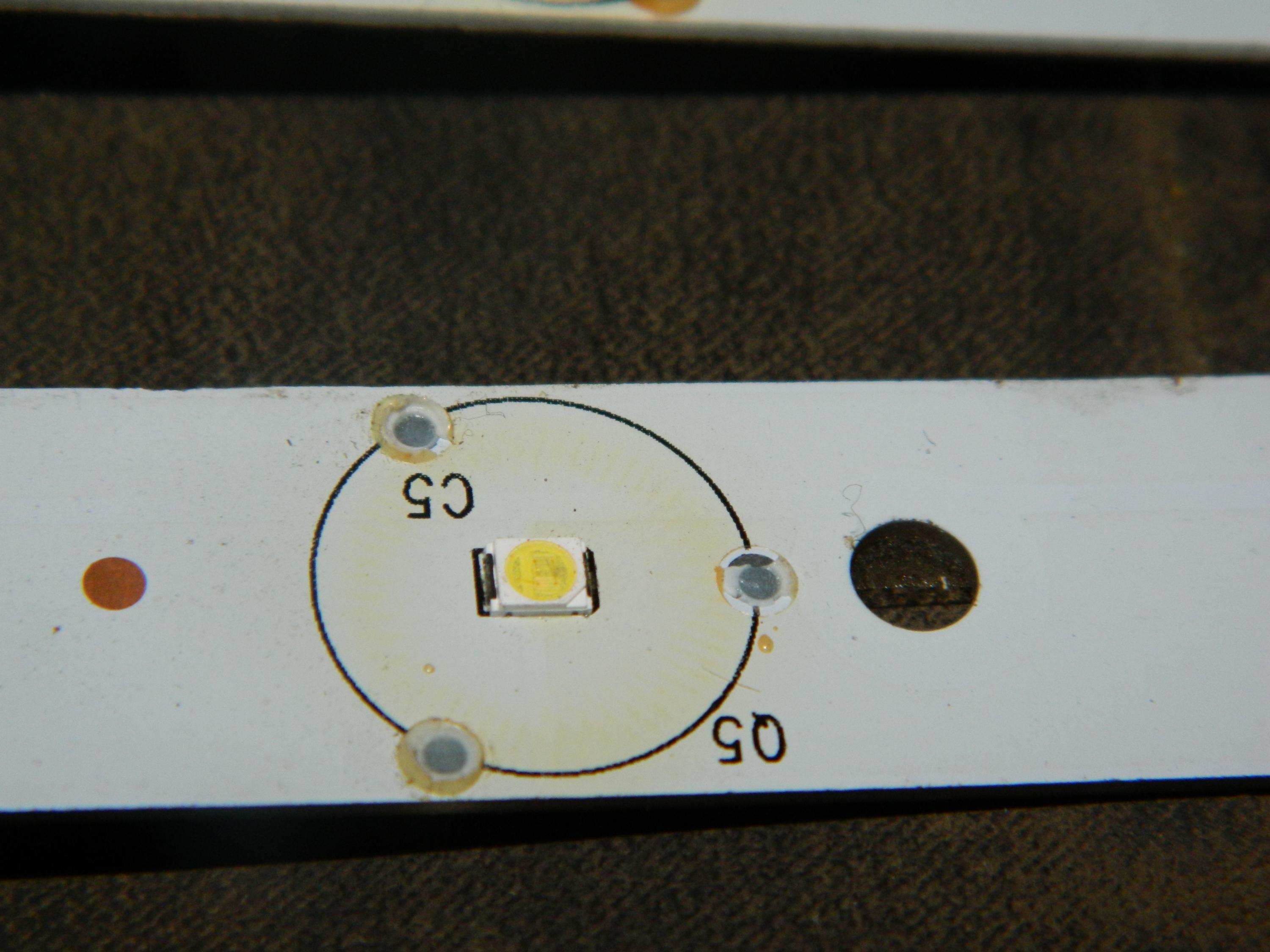 Notice that the larger pad is for the ANODE (+) on this package. Previous panels that I have repaired had the larger pad connected to the CATHODE. I still have a bunch with the larger CATHODE (I salvage them from broken screen TVs), but I cannot locate a source with the larger ANODE in a Vf range of less than 4V.