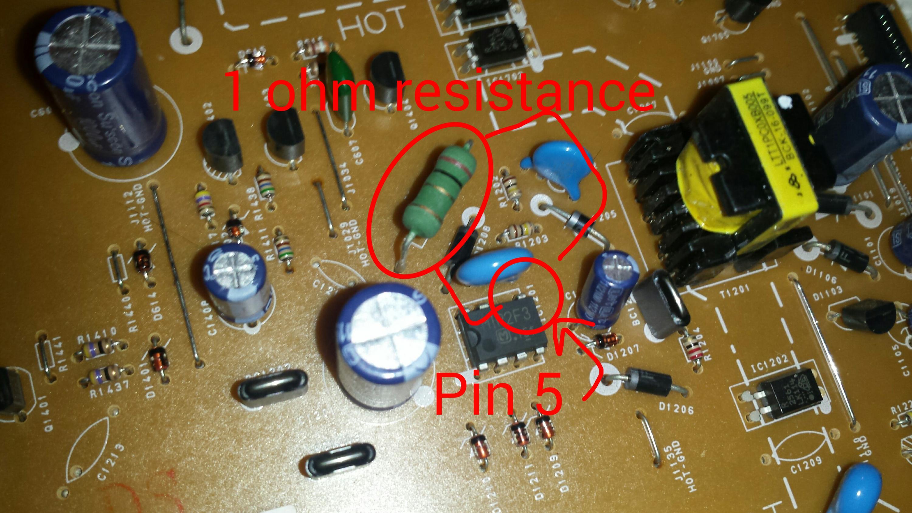 Ok that resistor gives me 1 ohm resistance and has continuity with pin 5 of the IC chipOK, you need to check the fusible resistor R1201 fusible resistor which feeds the main DCV to the SMPS IC1201 (we need P/N of this IC as well) to see if the resistor is OK, looks to be 1 Ohm resistor.
