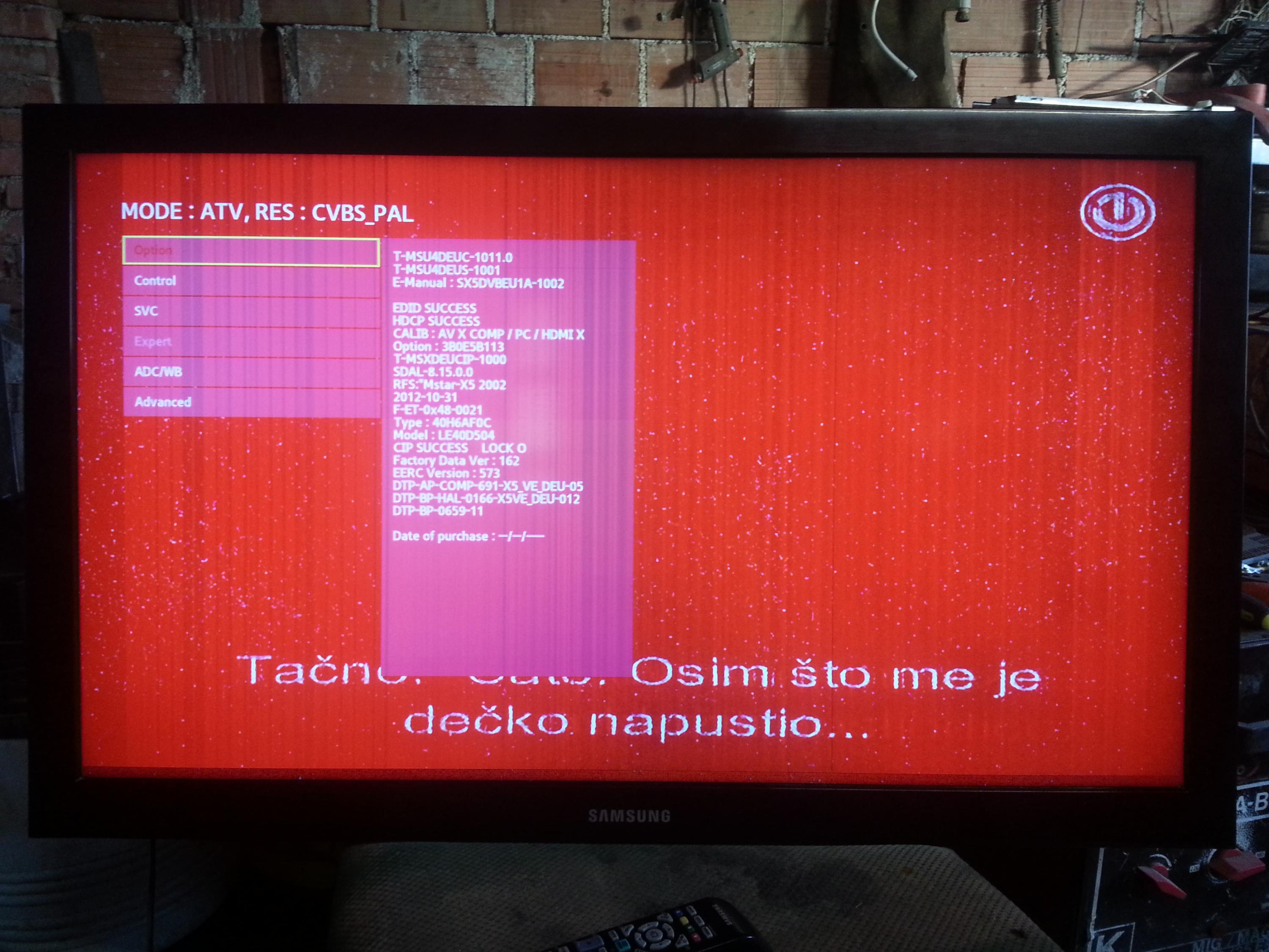 Okay, so I have a (rather old) samsung TV (full model is LE40D503F7W, more detailed info available in the images) and recently the screen just became red (see the pictures in the attachment, it's not entirely red, it's a red tint)